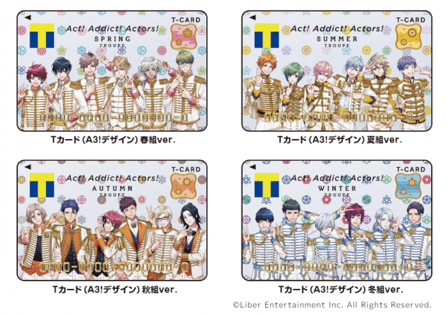 「Tカード(A3!デザイン)」は、 ゲーム2周年を記念したイラストを配したデザインで、 「春組」「夏組」「秋組」「冬組」の4種類よりお選びいただけます。