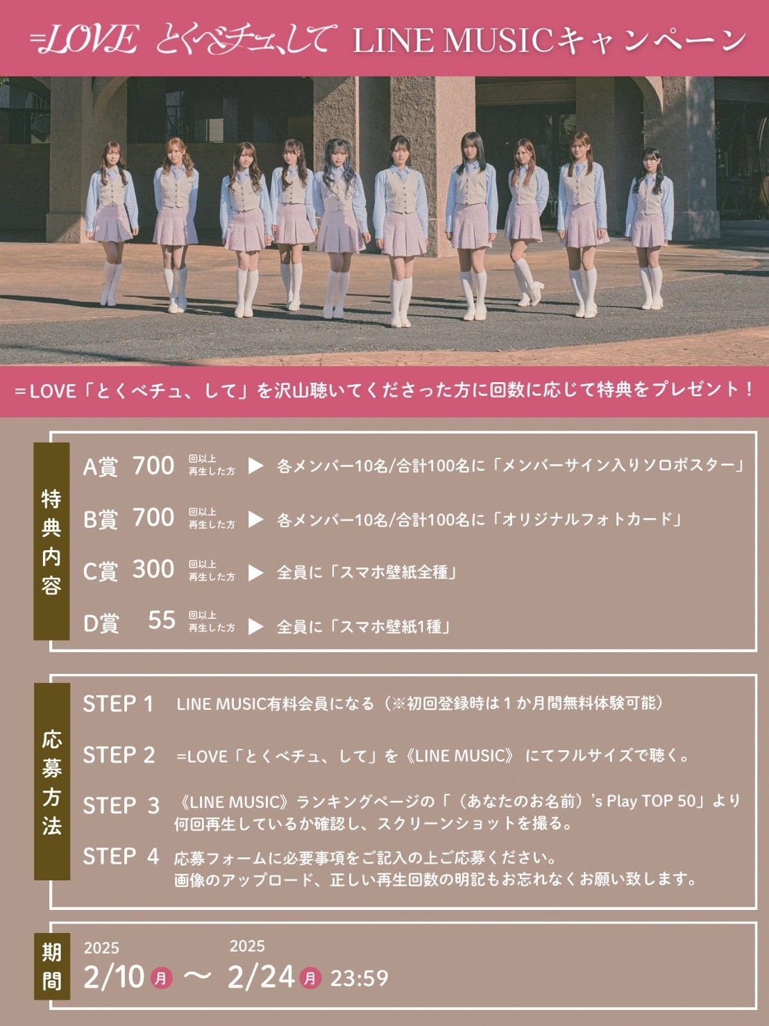 現在開催中のグループ二度目となるアリーナツアー『=LOVE ARENA TOUR 2025「~Timeless Tales~」』は、埼玉県、千葉県、愛知県、福岡県を経て、5月6日(火・休)東京都・国立代々木競技場 第一体育館にて千秋楽を迎える。2月26日(水)には両A面シングル『とくべチュ、して/恋人以上、好き未満』の発売を控え、さらに春には=LOVE 7周年コンサート「=LOVE 7th ANNIVERSARY PREMIUM CONCERT」のライブ映画化も決定している。2025年も勢いを増す=LOVEに今後も大注目だ。