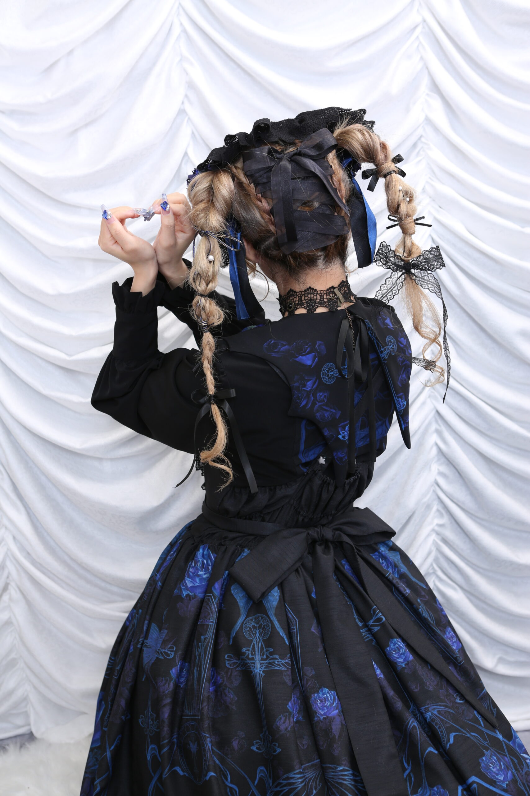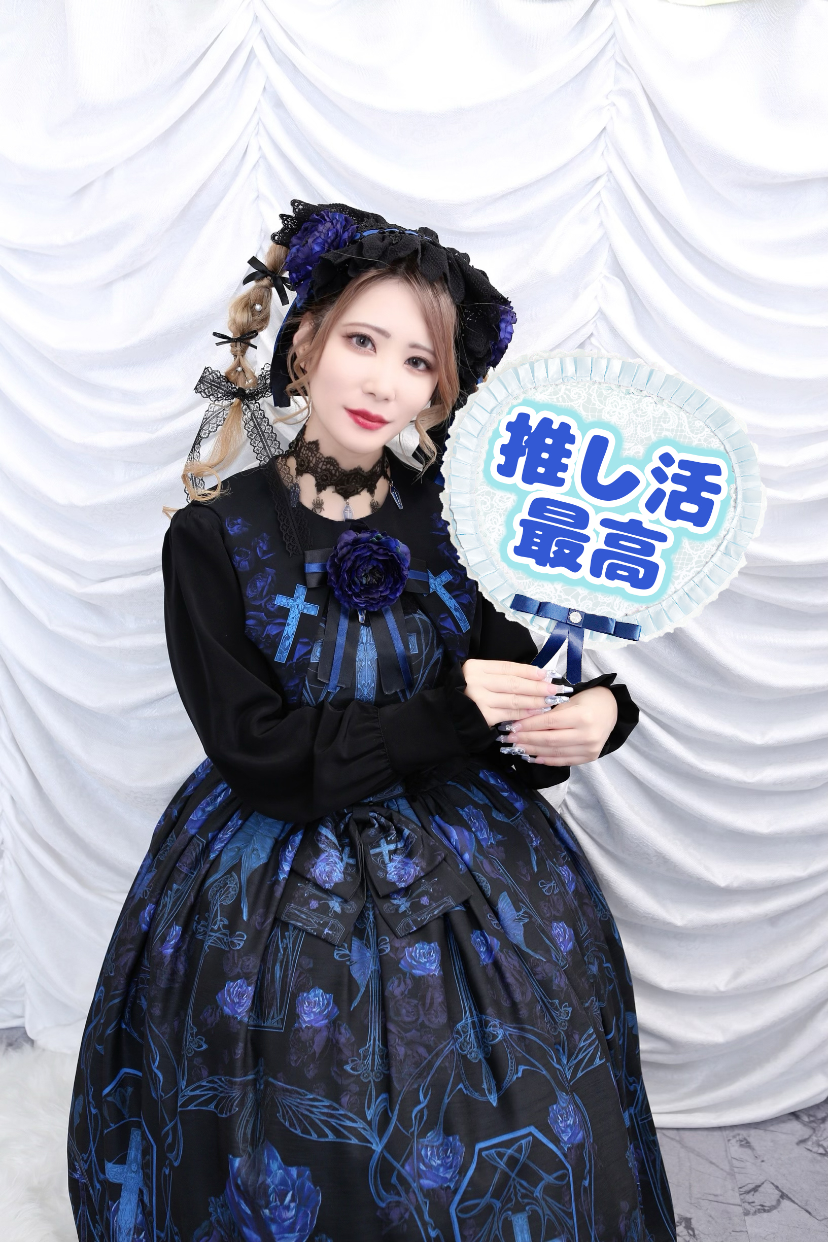 薔薇、棺、十字架、蝶などのTHEゴシックのモチーフがこれでもかと綴られた、絵画のように幻想的で繊細な1着です。