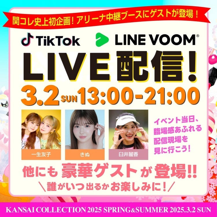 イベント当日、KANSAI COLLECTION公式のTikTokに加え、今回はLINE VOOMでLIVE配信を行います。ランウェイやアーティストのライブステージの生配信や、豪華出演者のトークなど特別な企画満載で来場者も会場に来れなかった方も、イベント当日の様子をお楽しみいただけます。