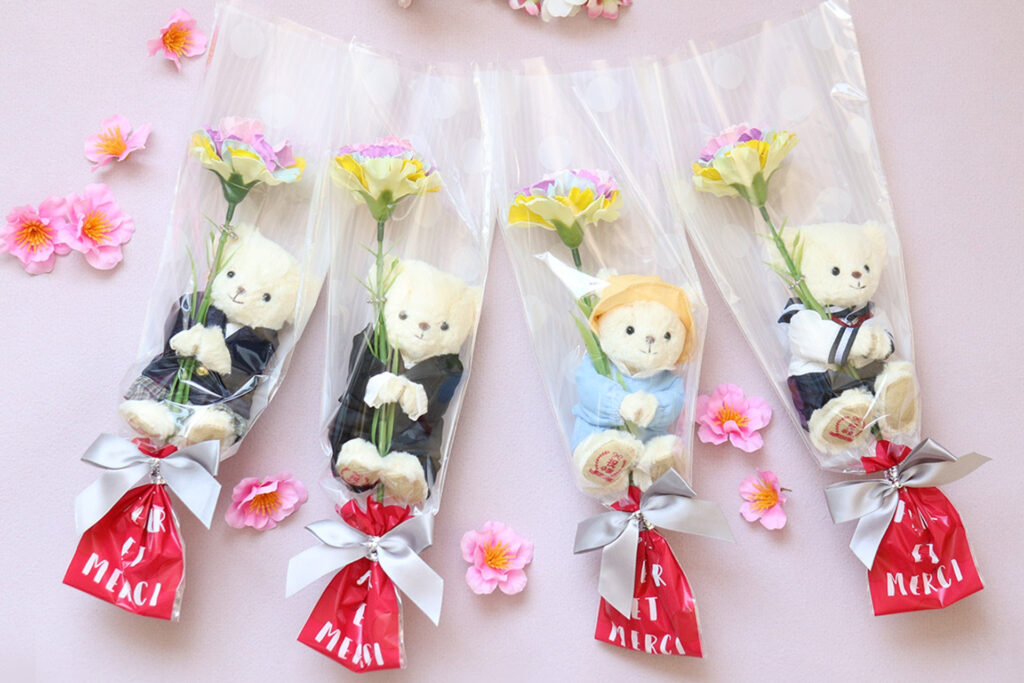 小さなテディベアが一輪の花を持っている姿は、とても可愛くてフォトジェニック。卒業式後の写真撮影にもぴったりです。