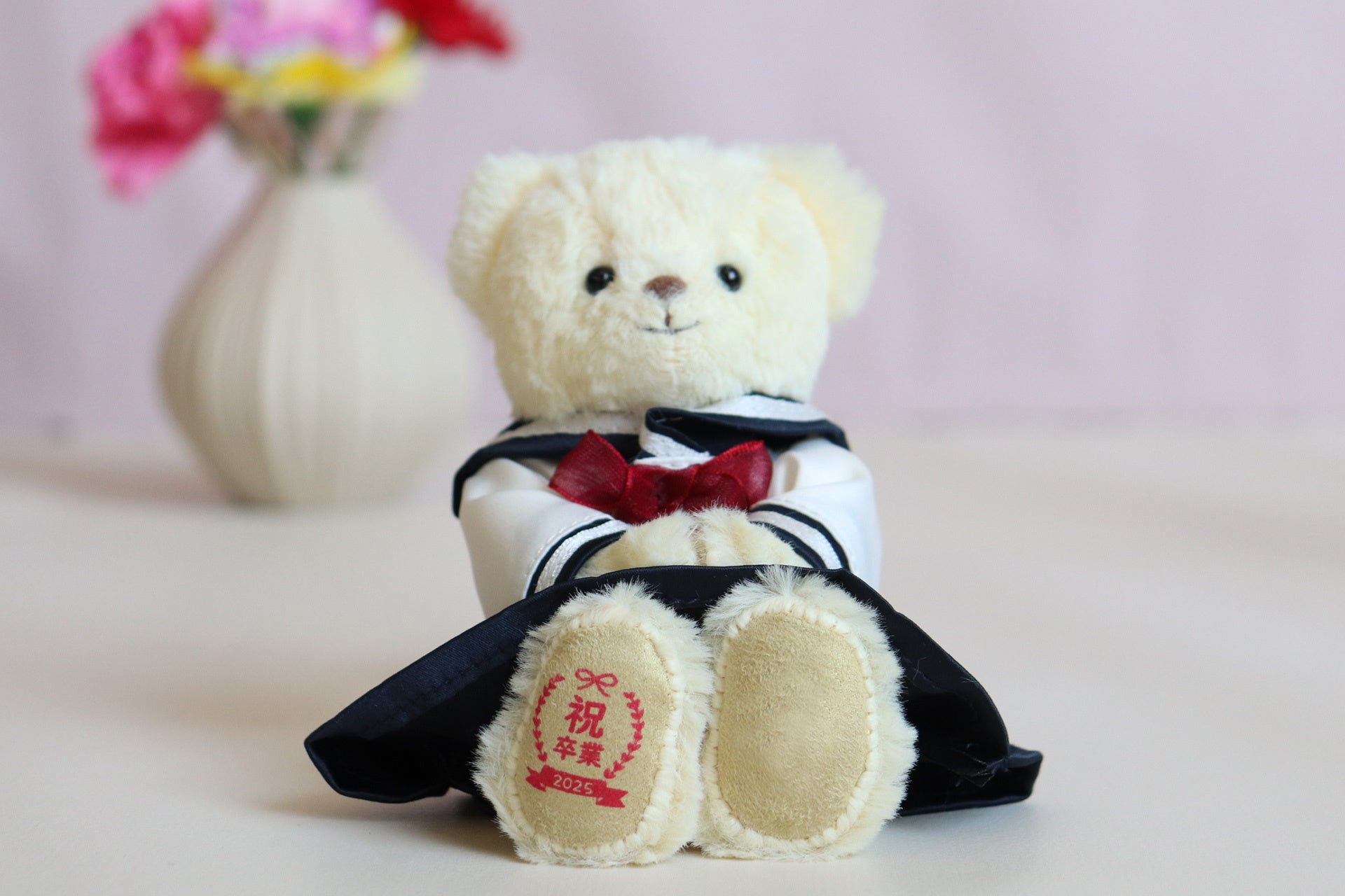 テディベアの足裏には「祝卒業 2025」のプリントが施されており、卒業記念品として最適です。