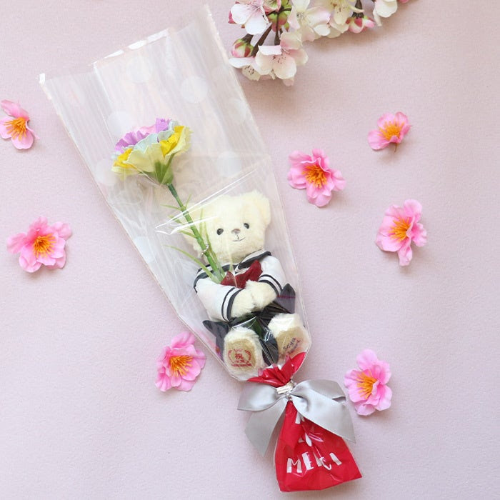 本商品は、華やかなソープフラワーの一輪ブーケに、制服姿のテディベアをセットした卒業記念にふさわしいギフトです。美しい見た目だけでなく、テディベアという存在が新たな生活の支えとなり、卒業後も心に寄り添い続けます。