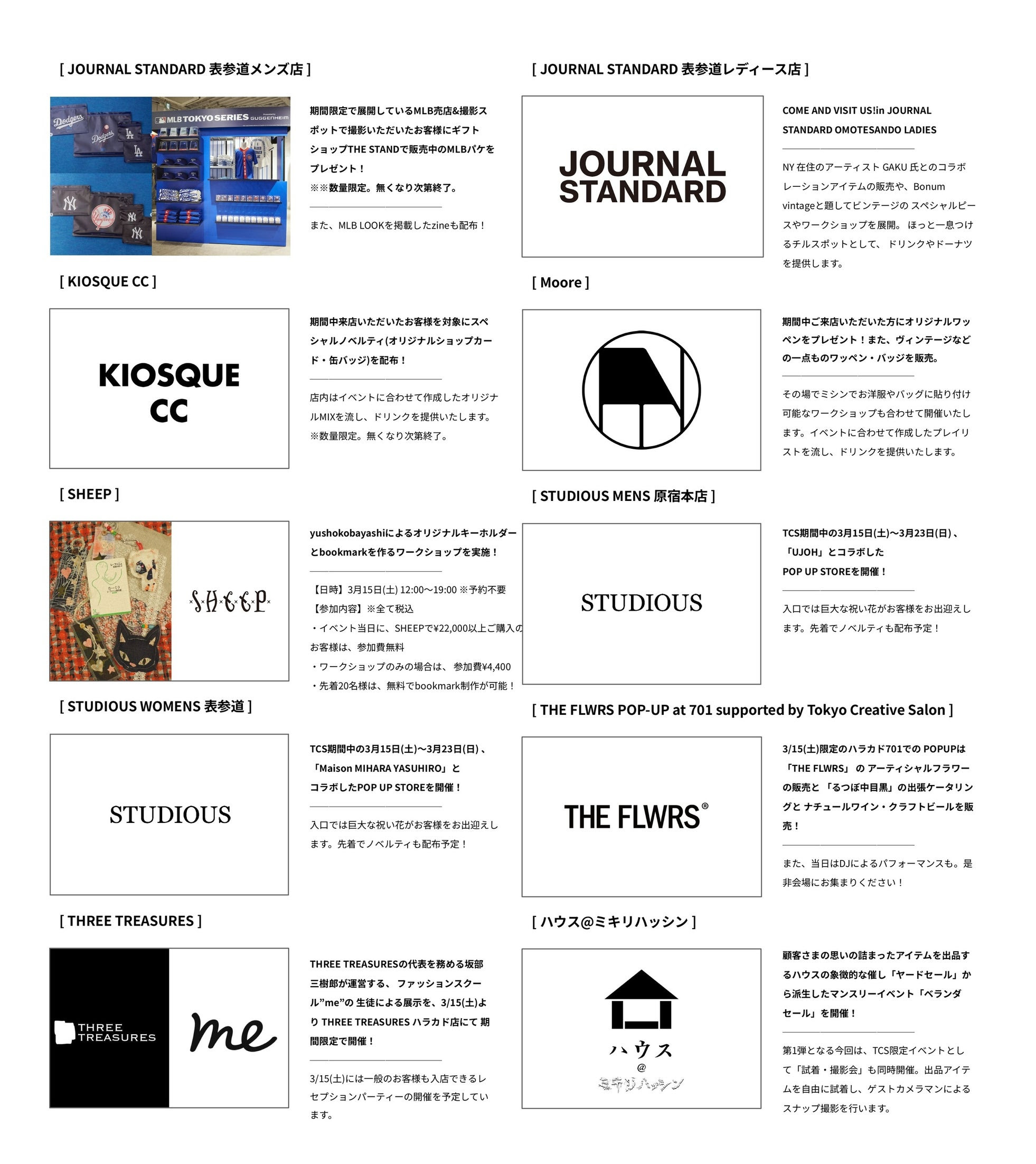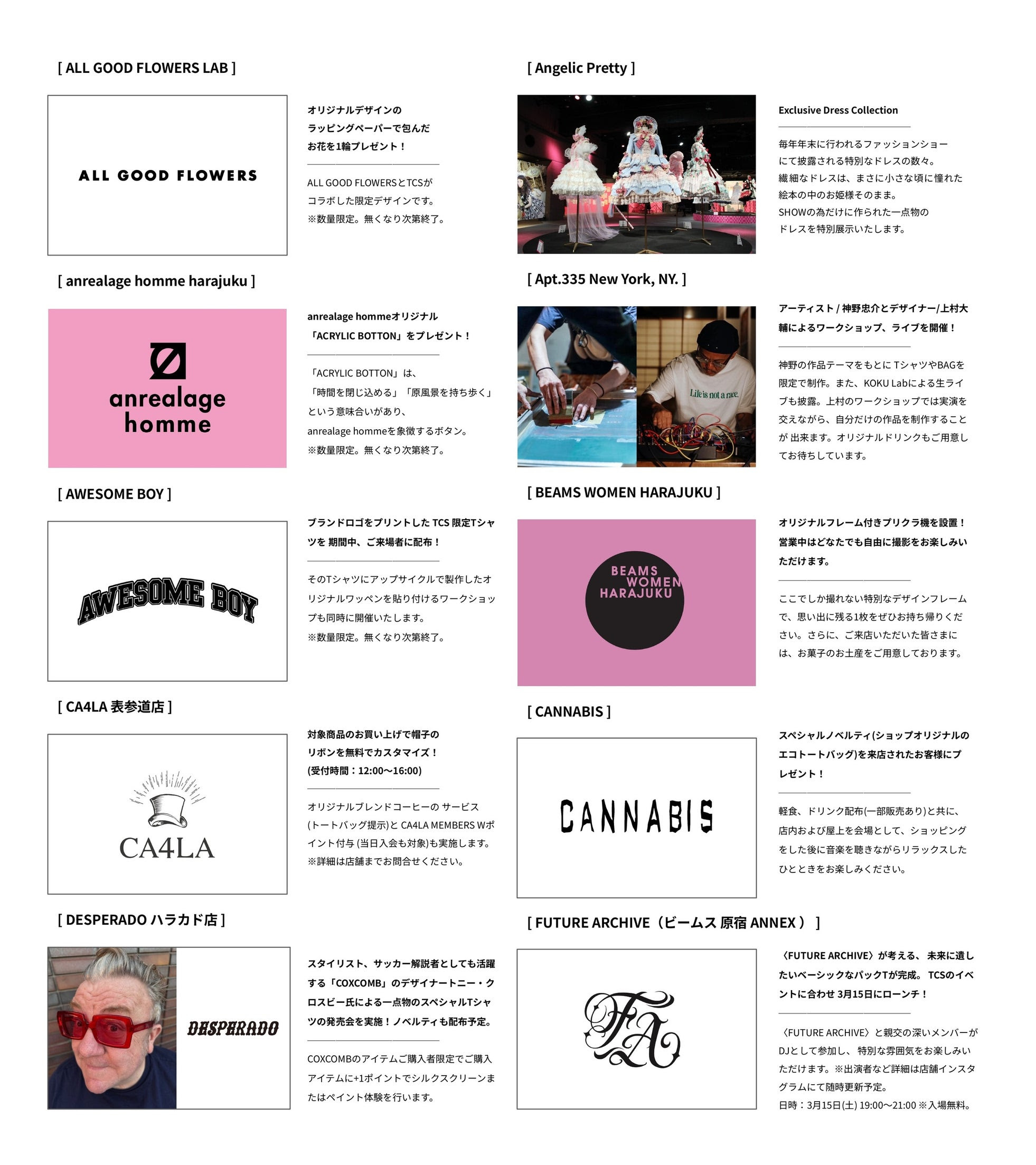 ALL GOOD FLOWERS LAB/Angelic Pretty/anrealage homme harajuku/Apt.335 New York, NY./AWESOME BOY/BEAMS WOMEN HARAJUKU/CA4LA 表参道店/CANNABIS/DESPERADO ハラカド店/FUTURE ARCHIVE(ビームス 原宿 ANNEX )/JOURNAL STANDARD 表参道 Mens/JOURNAL STANDARD 表参道 Ladies/KIOSQUE CC/Moore/SHEEP/STUDIOUS MENS 原宿本店/STUDIOUS WOMENS 表参道/THE FLWRS POP-UP at 701 supported by Tokyo Creative Salon/THREE TREASURES/ハウス@ミキリハッシン