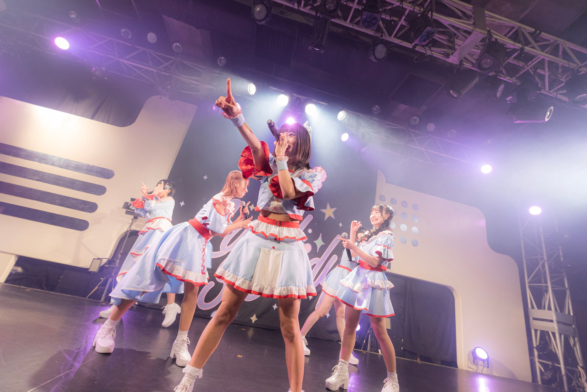 2番手は「かすみ草とステラ(3期生)」。衣装も個々のメンバーの印象も透き通るような“白”であり、曲やパフォーマンスもそのままに清潔感にあふれた空気感が会場に生まれたような気がした、錯覚!?かな……。“自由に泳ぐ”をコンセプトに活動する「selfish」はコンセプト通り、自由に楽曲派向けから王道なアイドルソングまで、いろんなジャンルの曲を披露、北海道からこのイベントに参加したという「限りなく白く」は、ほんわりした雰囲気とグループ全体の一体感が感じられる楽曲がとっても心地よかったっす。なんか学生時代にみんなで歌った合唱曲を歌った時のような歌声を思い出したような。5番目に登場した「最終未来少女」は、ちょー独特な世界観とどこかなじみのある存在感が調和したステージだった。個人的には中毒性を感じて、引き込まれかけた…!!!あぶねーっ。次に出てきた「Toi Toi Toi」はアイドルらしいかわいい衣装とはギャップがありまくるキレキレのダンスナンバーからはじまって、次は萌え萌えソングを続けるという2刀流でびっくり。