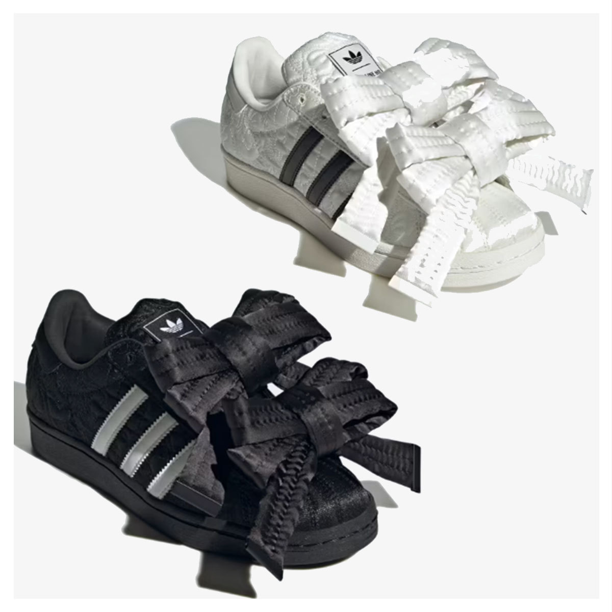 アディダスの名作「スーパースター」をベースに特大のリボンや、光沢感のあるサテン生地にキルティングや花柄を表現。可愛いが詰まっていますね♪