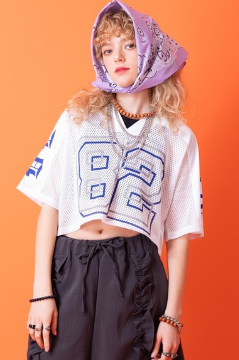 より個性あふれるコーデをしたい方は、クロップドスタイル&メッシュ素材のアイテムはいかが?数字が浮き上がるデザインが唯一無二♡