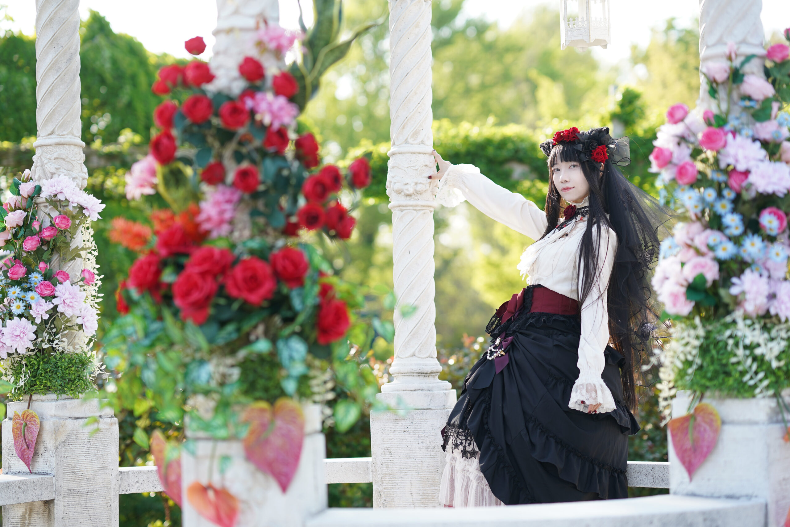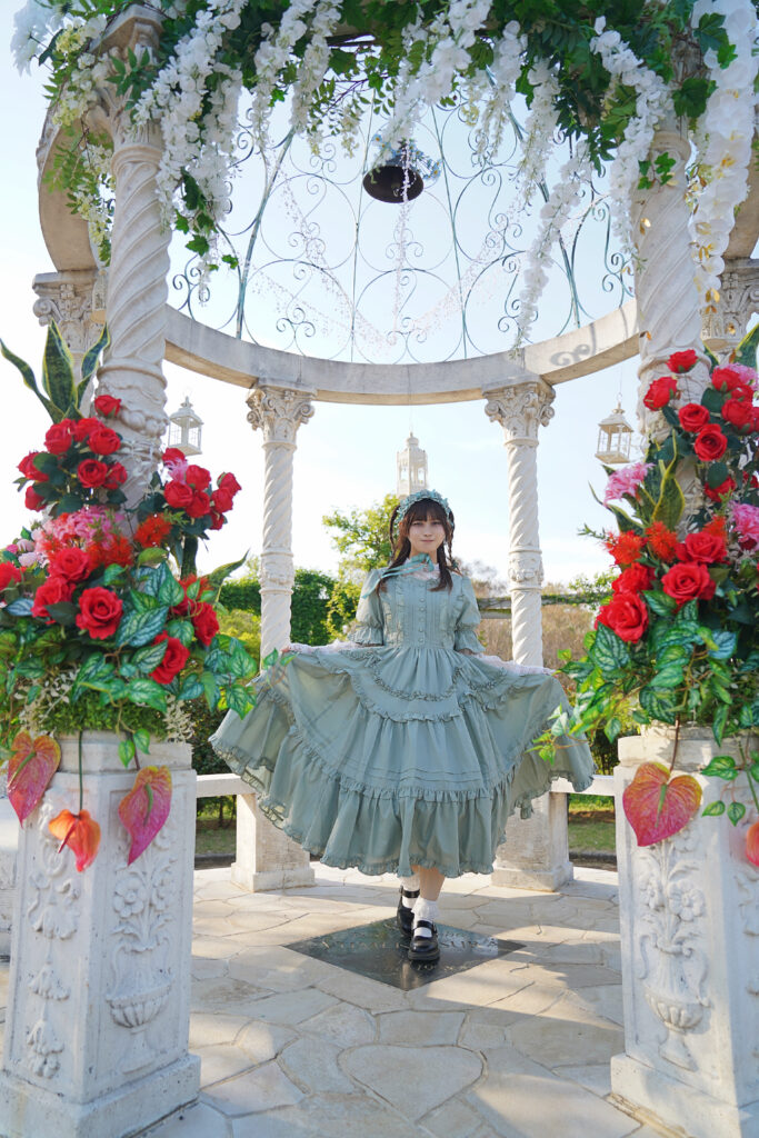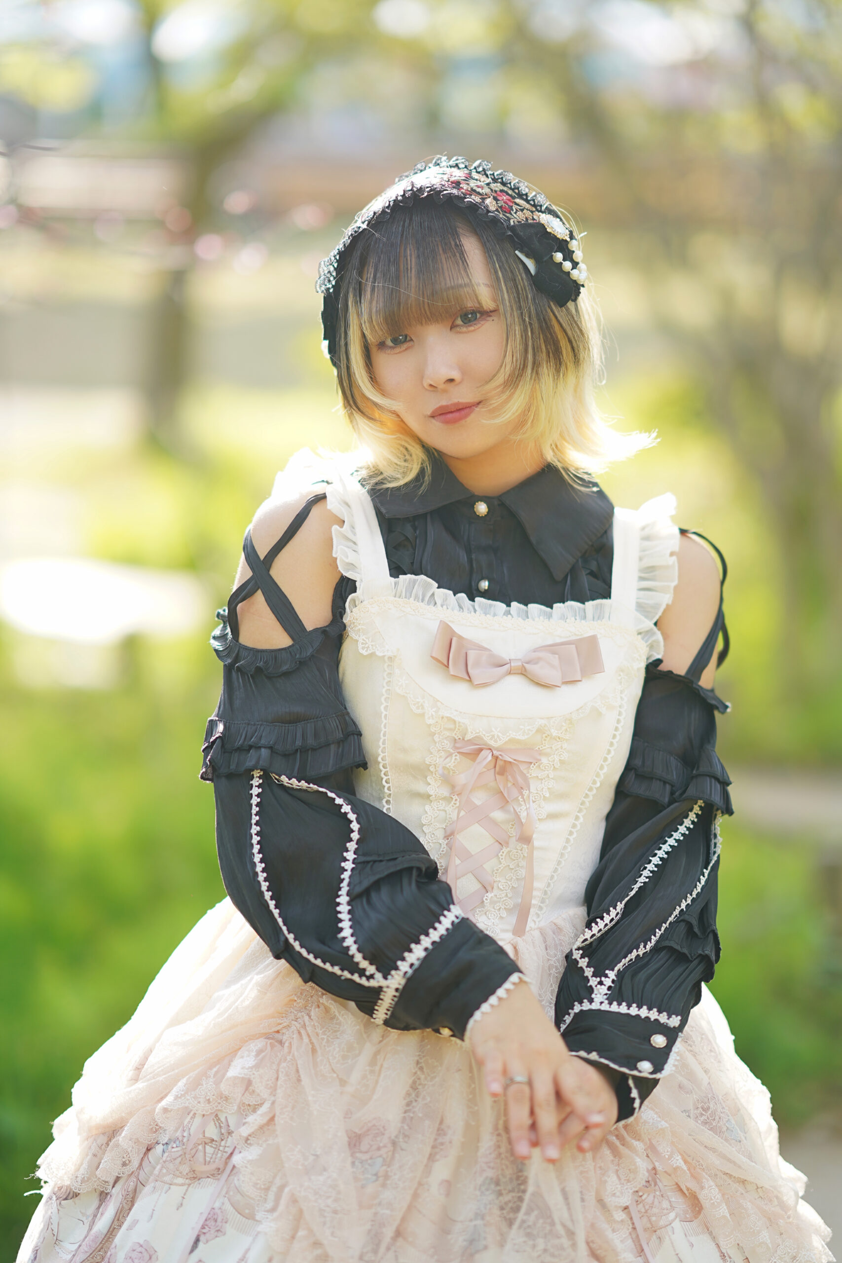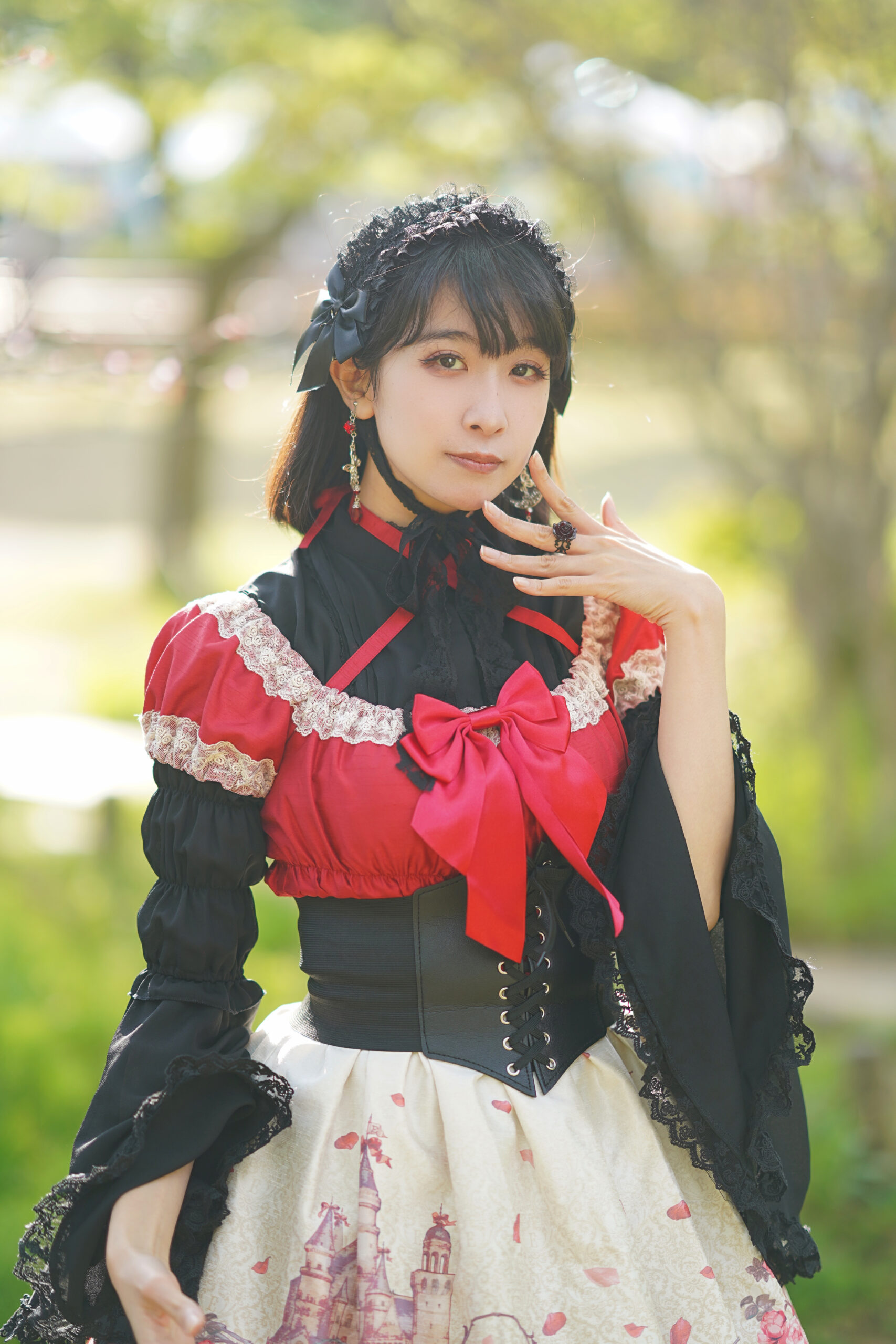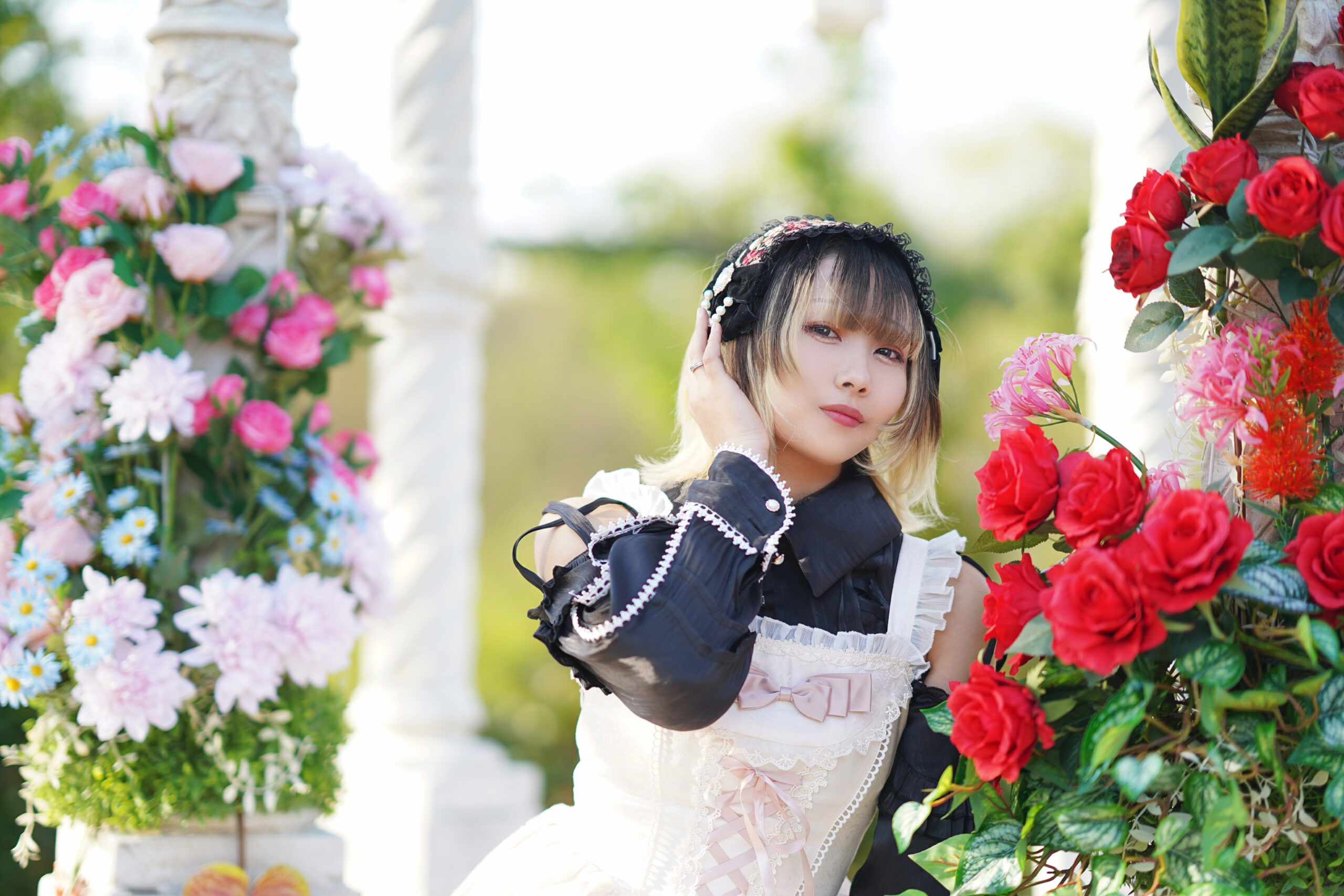 ヘッドドレスや胸元、靴下にまでバラのモチーフを散りばめた、こだわりたっぷりのスタイルは、まるでバラ園の一部になったかのよう♪
