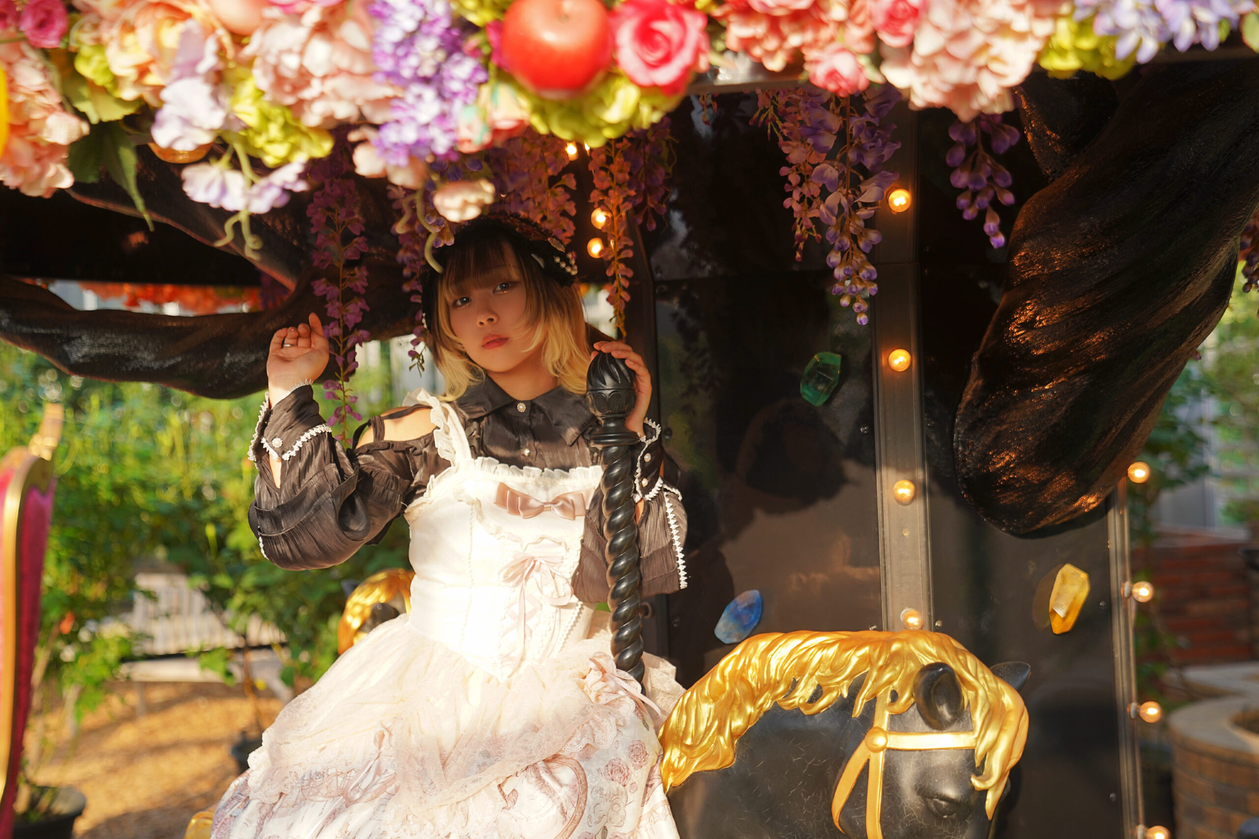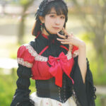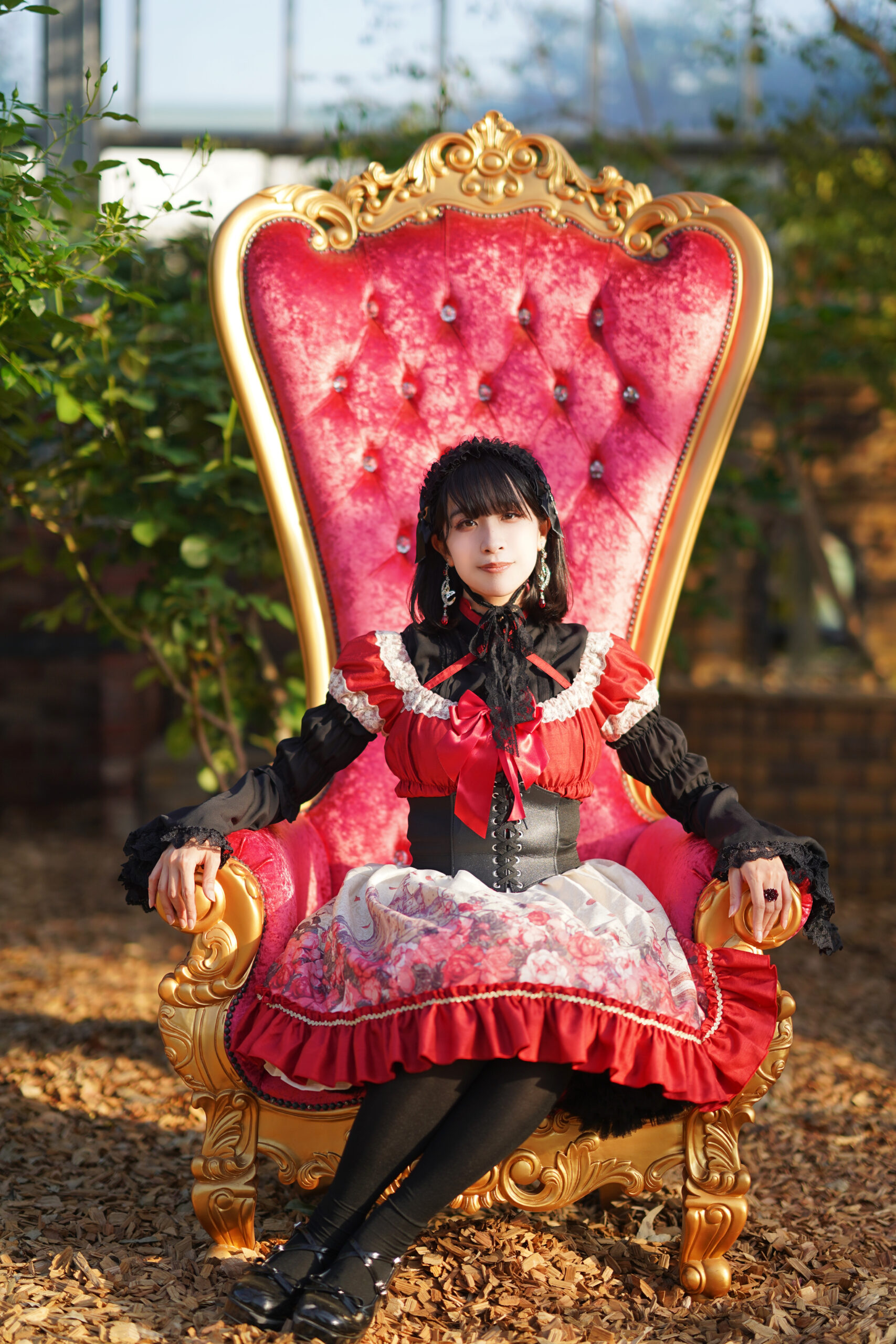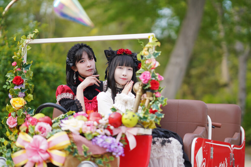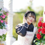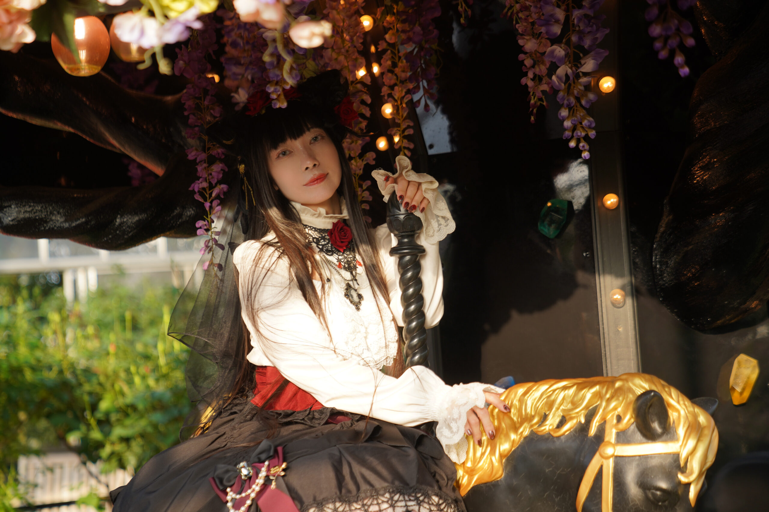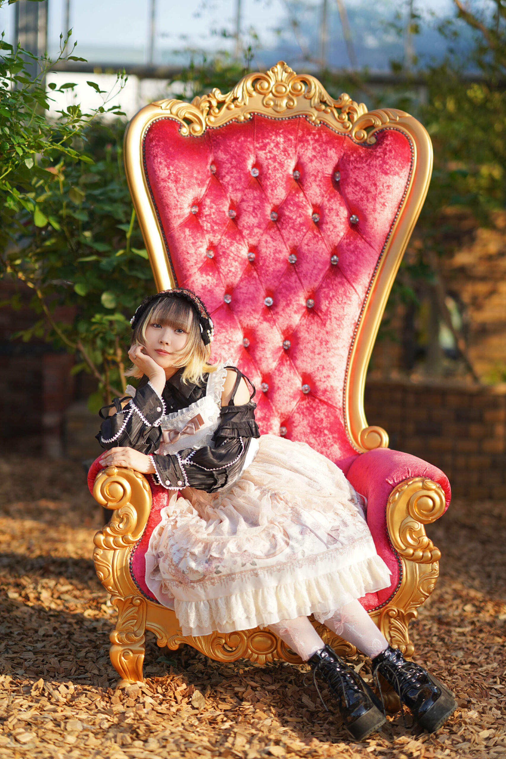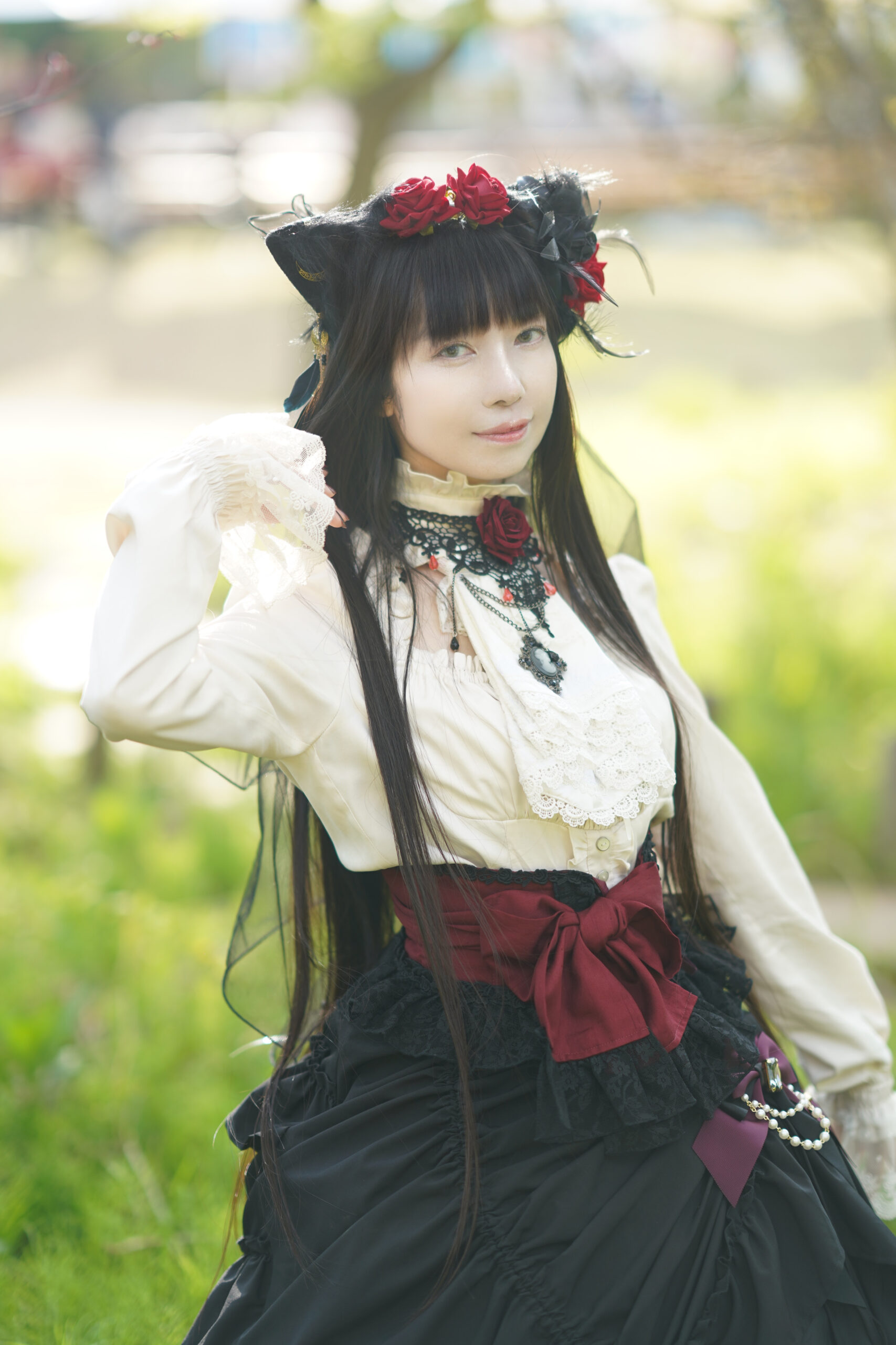 ヘッドドレスや胸元、靴下にまでバラのモチーフを散りばめた、こだわりたっぷりのスタイルは、まるでバラ園の一部になったかのよう♪