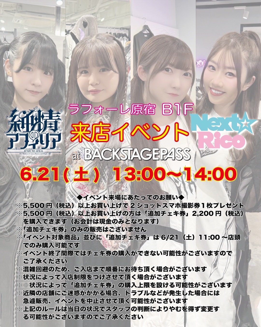 イベント当日にBACKSTAGEPASS ラフォーレ原宿店で 5,500円(税込)以上お買い上げで、2ショットスマホ撮影券をプレゼント致します。(お客様のスマホでの撮影となります。自撮り不可)