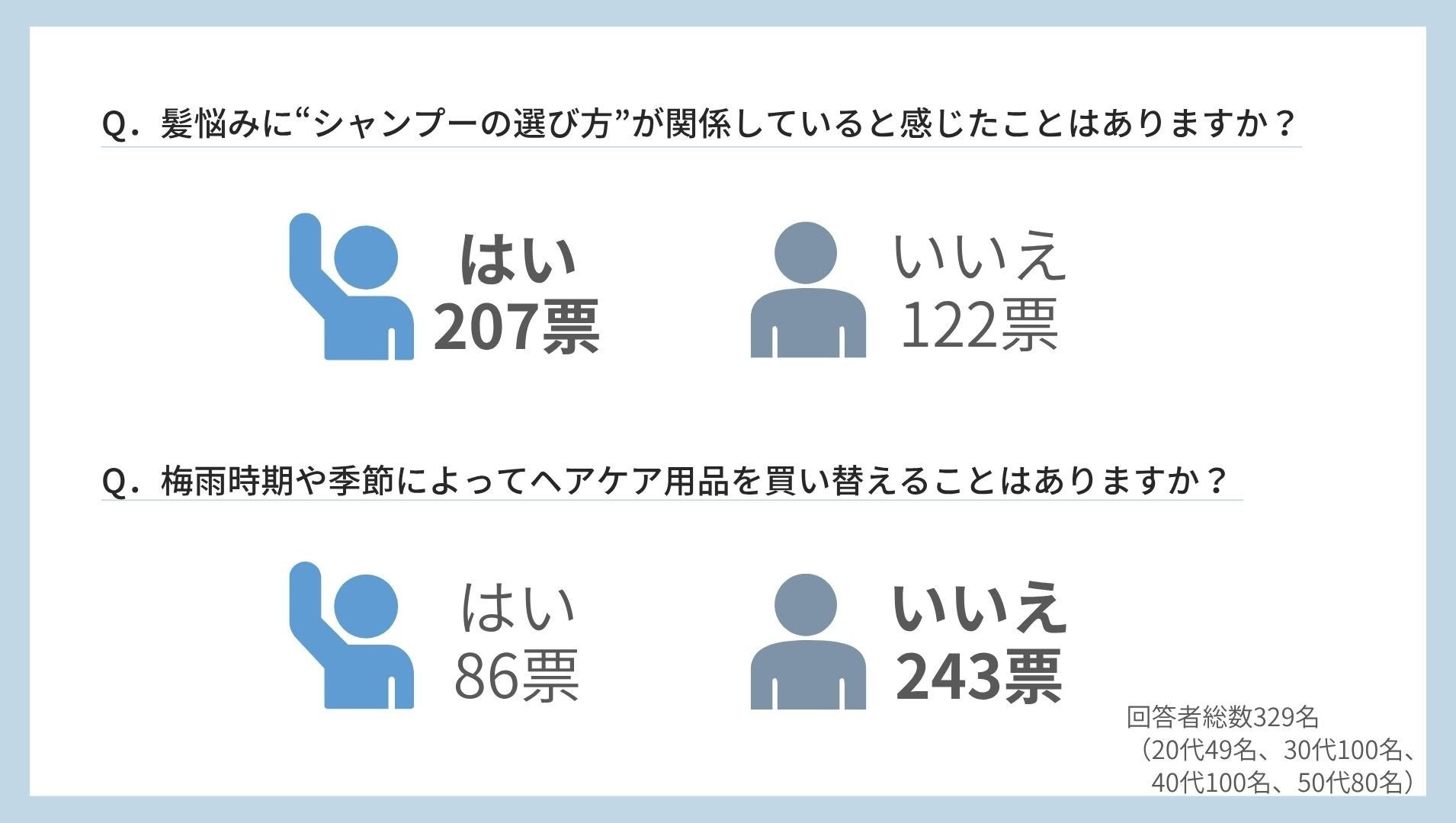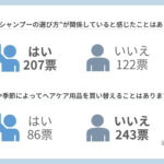 一方で、梅雨時期や季節によってヘアケア用品を買い替えることはありますか?と尋ねたところ、意外にもヘアケア用品の買い替えをしない人が7割を超える結果となりました。