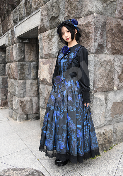 黒基調のクラシカルな雰囲気に映える青の薔薇や十字架がとても可愛くて、神秘的なお洋服の世界観に一目惚れしてしまいました>< ヘッドドレスにも黒に映える綺麗な青い薔薇と青いリボンが編み込まれていてとっても可愛いんです。上品さと秘密めいた雰囲気の漂う洗練された美しさは自分が自分でいるための戦闘服みたいでした。