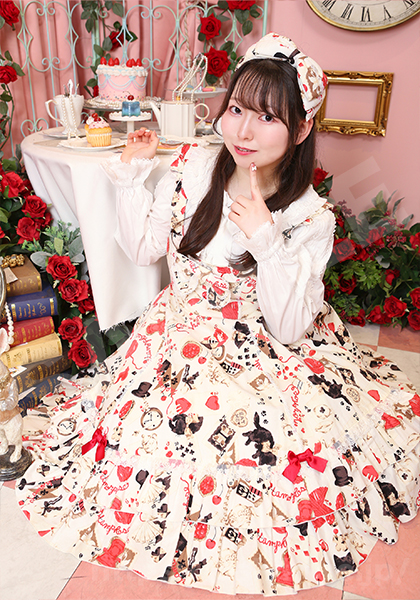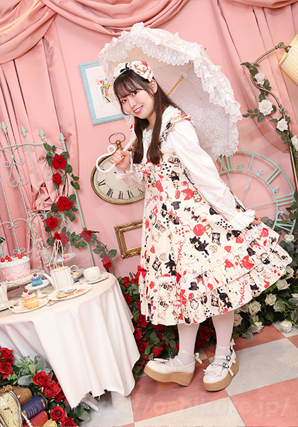 今回は、2着ロリータ服を着させて頂いたのですが、第1週目はクラシカルな白のロリータ服を着ました。至る所にいる自由気ままな猫ちゃんがたくさんいて可愛いのですが、よく見るとトランプや帽子やお菓子など不思議の国のアリスぽさもあるんです。ヘアアクセのリボンも合わさってアリスぽくてクラシカルな中に遊び心がある所がお気に入りです。