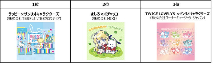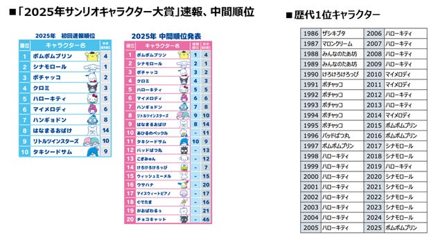 1位「ポムポムプリン」、2位「シナモロール」、3位「ポチャッコ」のトップ3は安定した人気と存在感を示しました