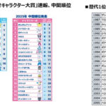 その他、今年アニバーサリーイヤーを迎えている、50周年の「マイメロディ」と「リトルツインスターズ」が6位、7位と続き、40周年の「ハンギョドン」が8位にランクインしました。また、結成5周年の「はぴだんぶい」のメンバー(ポチャッコ、ハンギョドン、タキシードサム、あひるのペックル、バッドばつ丸、けろけろけろっぴによる、男のコ6キャラクターのユニット)もTOP20に名を連ね、中でも「あひるのペックル」は、1994年以来、31年ぶりのTOP10入りを果たしました。さらに、デビュー3年目の「はなまるおばけ」(14位→12位)や、北米を中心に人気を集める「ウサハナ」(20位→17位)が順位を上げました。