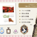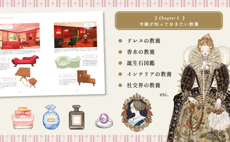 <Chapter3>では、「令嬢が知っておきたい教養」として、公爵や伯爵といった英国貴族の爵位の解説や、かつて貴族令嬢の間で流行した紅茶占いのやり方、ドレスの歴史、貴族の邸宅の調度品、舞踏会などの社交界の教養を紹介。宝石言葉や花言葉など、令嬢が知っておきたい、ときめく知識もイラストたっぷりで学べます。
