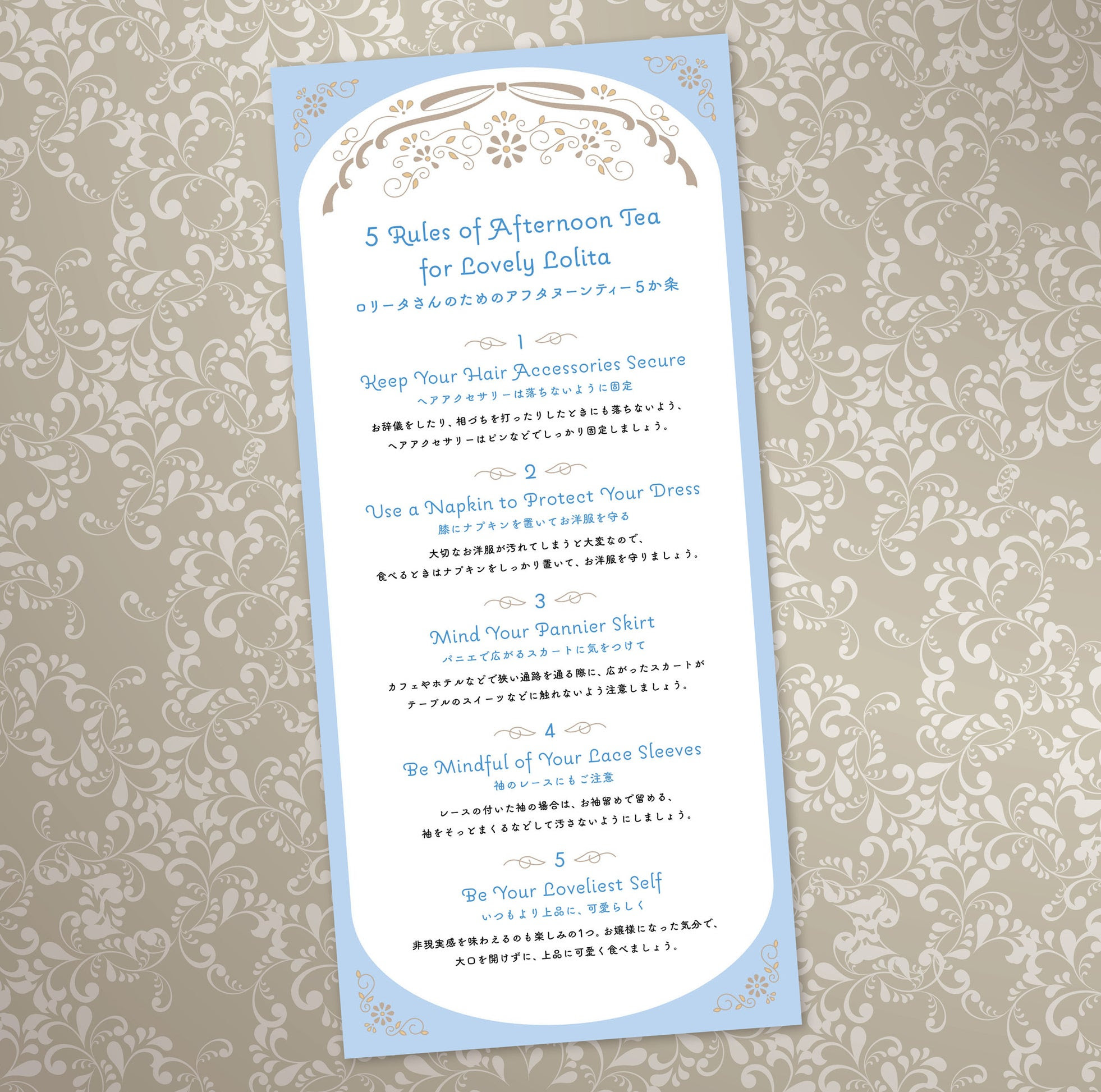 ▲ダウンロード特典の1つめは、青木美沙子さん監修の「ロリータさんのためのアフタヌーンティー5か条」特製デジタルカード。パーティーの招待状のようなときめくデザインで、スマートフォンにダウンロードすれば、アフタヌーンティーに出かける際にも持ち歩くことができます。(※画像はイメージです)