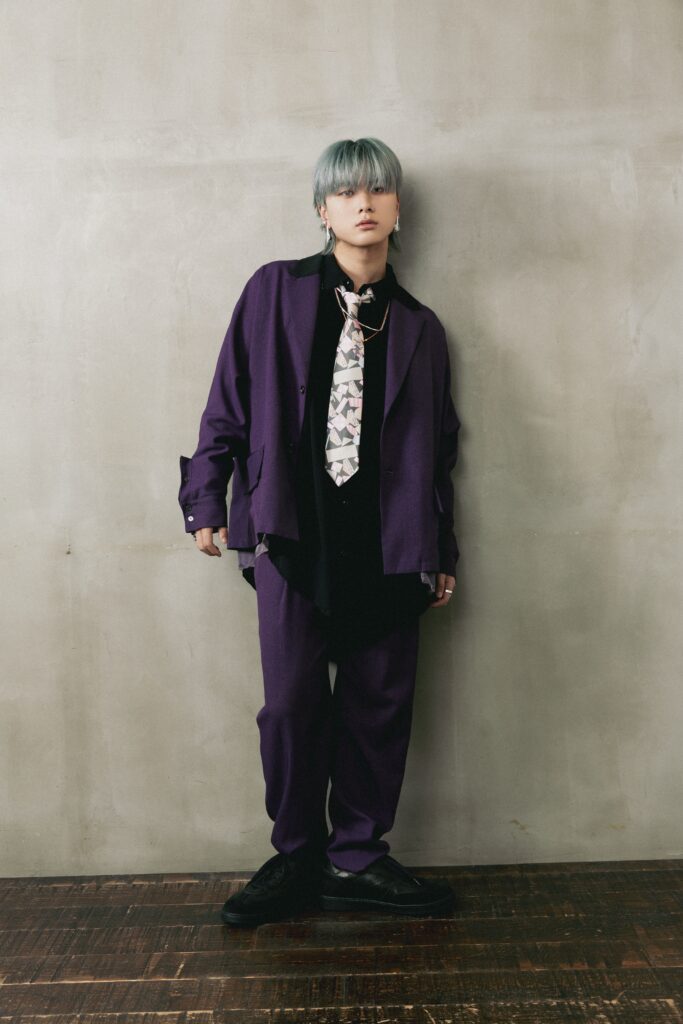 岡尾真虎さんが着用するのは、流行色のひとつであるダークパープルのセットアップ。