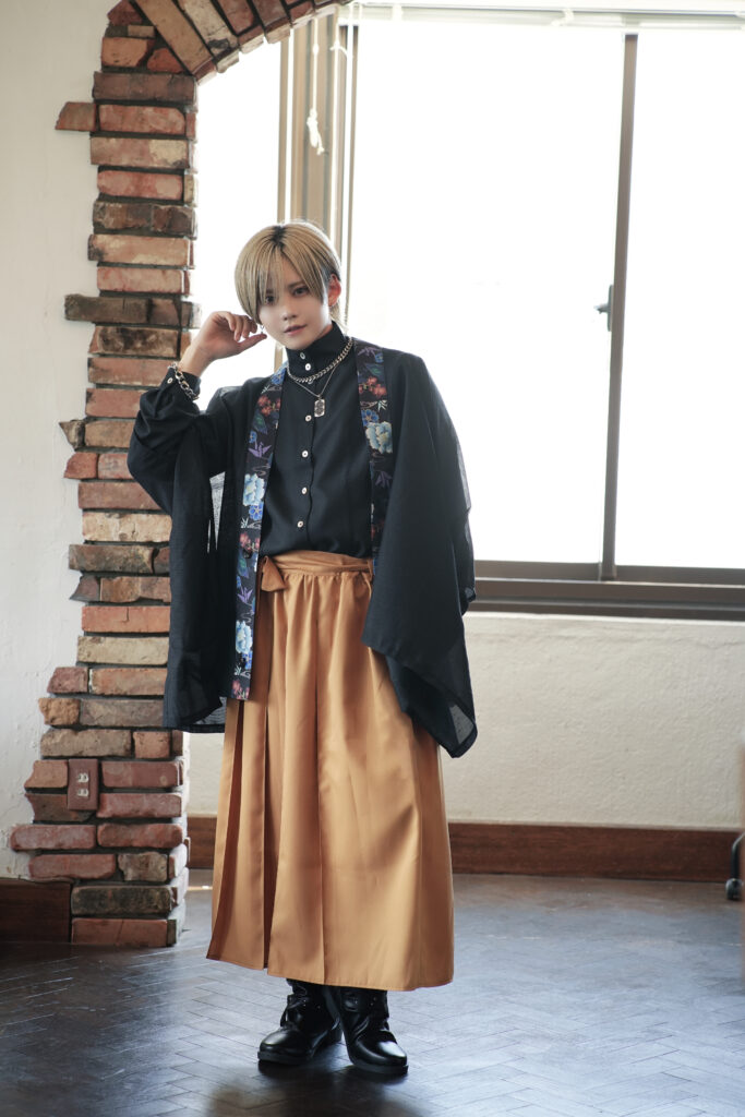 ボトムスの袴パンツは、柔らかな光沢を宿した黄金色が印象的。