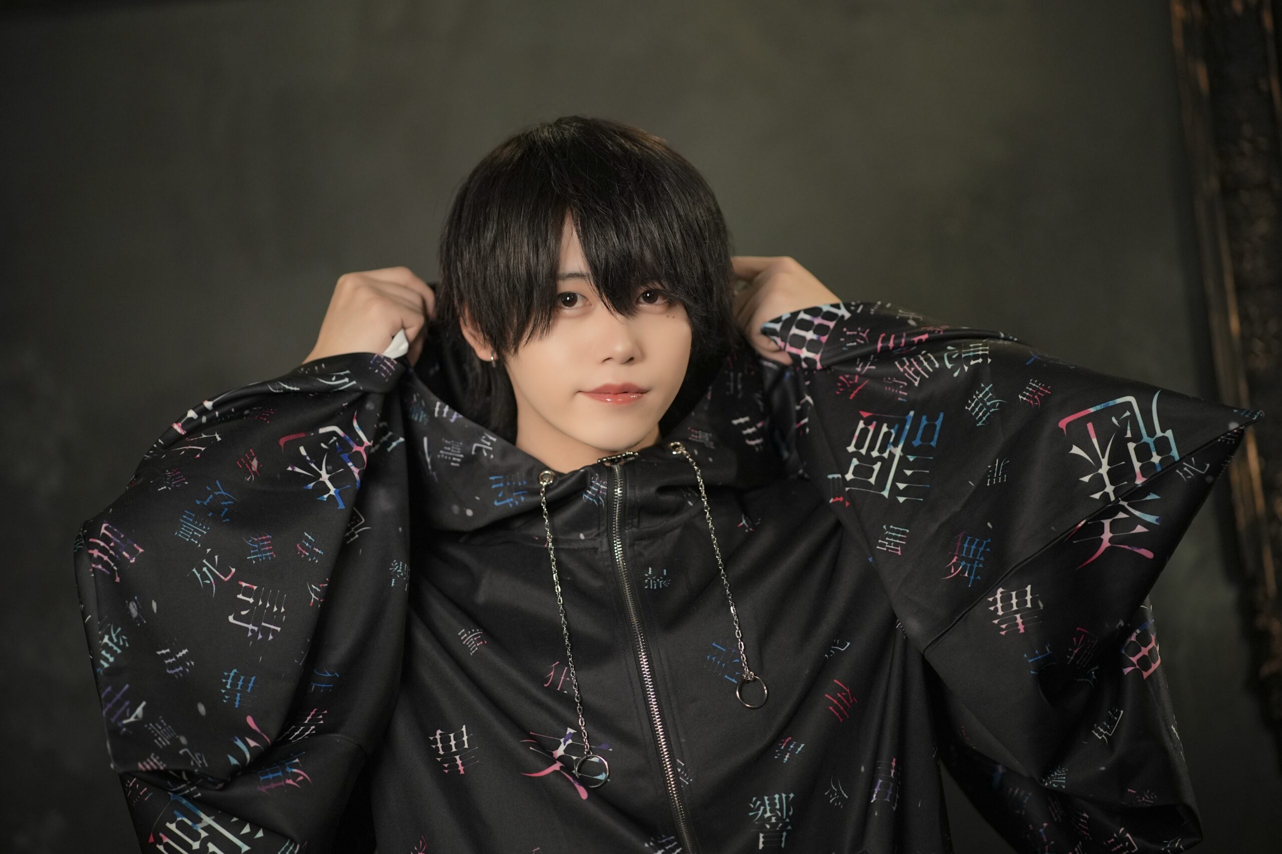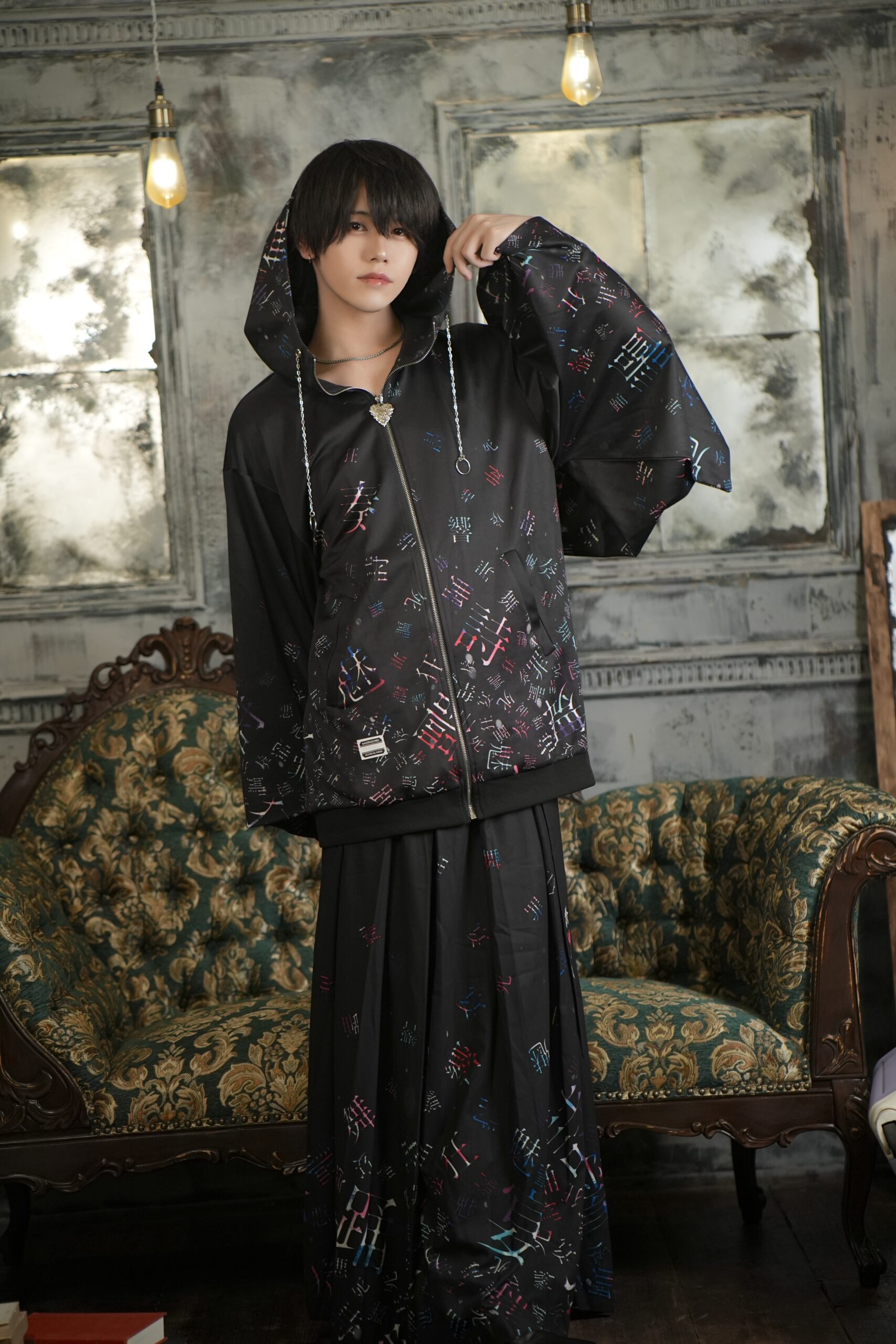 全身を包む黒のフーディーには、無数の漢字がまるで呪文のように散りばめられ、赤や青のネオンカラーがアクセントとなって浮かび上がります。
