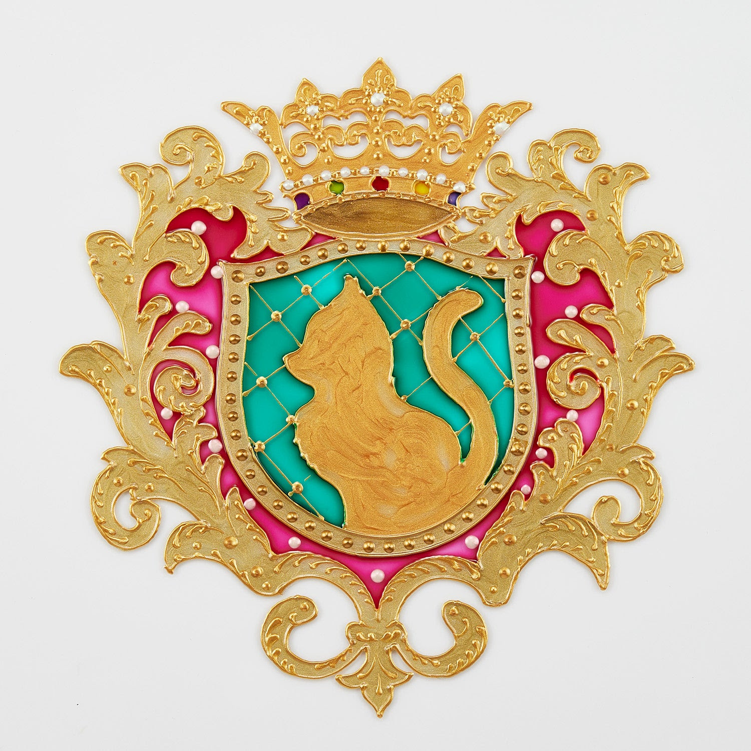 缶の底面には、『ネコのトランプ缶2』のオリジナルエンブレムを配置。ふっくらとしたネコの横顔のシルエットがエレガントな「ネコのエンブレム」です。エメラルドグリーンと艶やかな紅色、ゴールドがよく映えます。