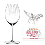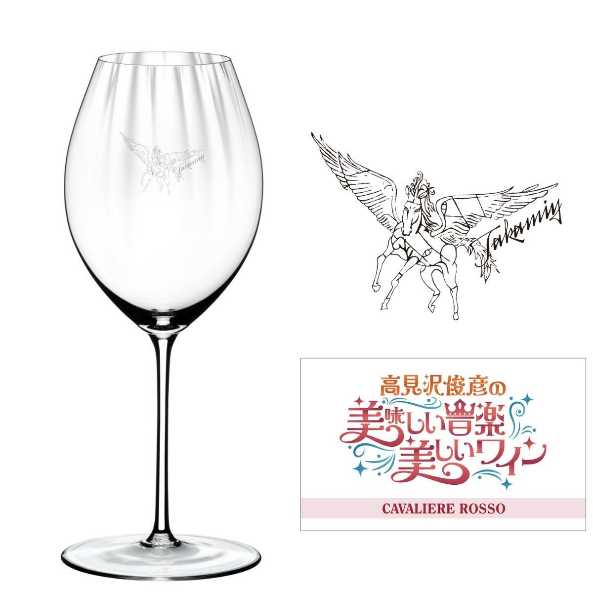 サンマリノに自身のぶどう畑を持つほどにワインにこだわりを持つ高見沢さん。オリジナルシリーズの赤ワイン「紅騎士」に合わせてセレクトしたグラスに、午年の高見沢さんのシンボル、ペガサスの絵をサンドブラストの技法で施し、刻印。名刺サイズの番組ロゴマーク入り。