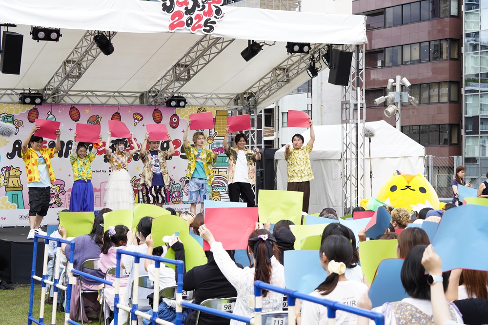 『声優と夜あそび2025』のステージでは、番組を代表するベテランMCから、今年から参加のフレッシュなメンバーまで勢揃い。出演者全員がアロハシャツを身にまとい、「まだまだ夏は終わらない!アゲアゲ夜あそびアロハ祭り!」と題した夏仕様のスペシャル企画を実施しました。過去の名シーンから3択クイズが出題される「あの夏を思い出せ!夜あそびサマークイズ!」では、チャレンジ成功のご褒美「アゲアゲタイム」が会場の観客を巻き込み大盛り上がりに。突如現れたマッチョ軍団たちの水鉄砲による“ぬれぬれアゲアゲタイム”に、9月とは思えないほどの熱気に包まれました。さらに、“ビリビリ椅子”の罰ゲームが待ち受ける「みんな一緒に!ビリビリジェスチャーゲーム!」では、慣れないジェスチャーやMC陣の全力演技に、正解・失敗問わず会場爆笑の展開なりました。また、イベント終盤では、“渋谷”にちなんだ制限時間“428″秒以内に会場に集まった観客全員に風船を配り、全員で一斉に割るというスケール感満載のチャレンジ企画「みんなに配れ!風船ドンパチ大合戦!」も。時間内に配り切れるか不安もよぎる中、マッチョ軍団やスタッフ総出の総力戦のチャレンジは見事大成功し、大団円となりました。