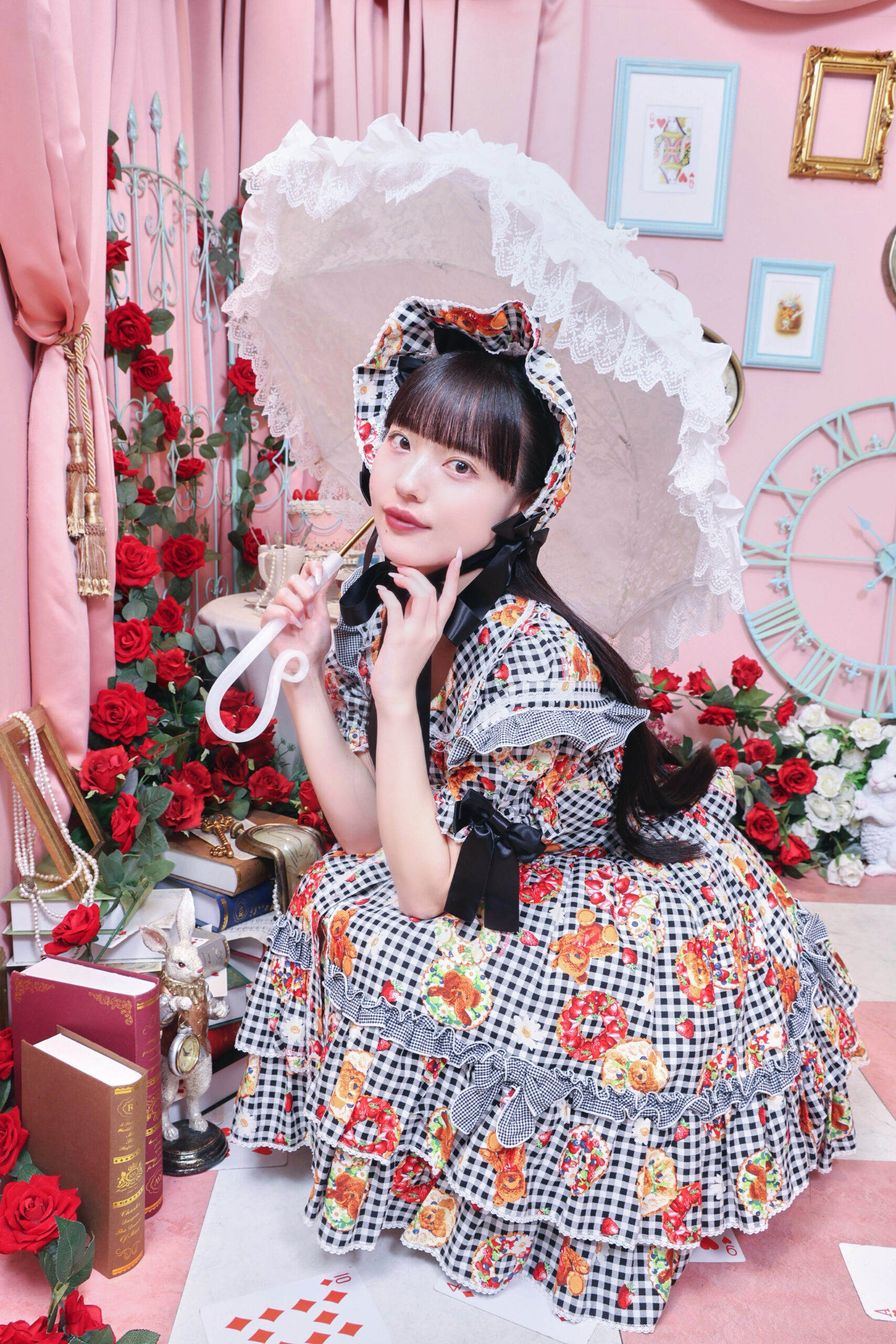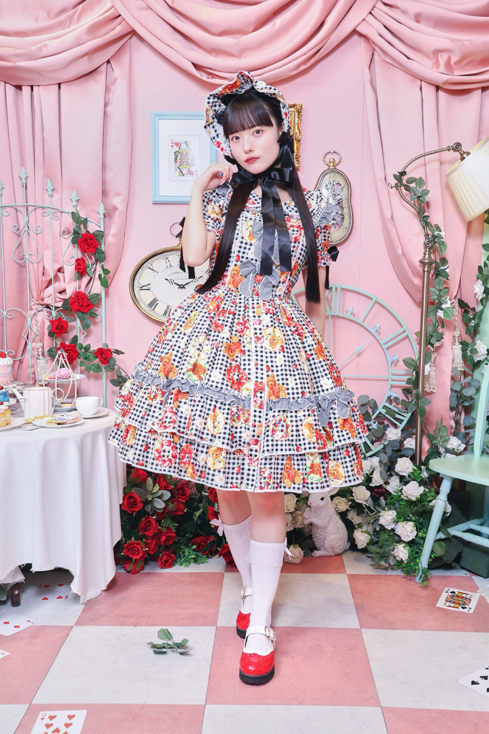 キュートな柄に加え、惜しみなく使われたフリルやリボン、そしてふんわりと優雅に広がるシルエットが、まさに愛らしさの極み。