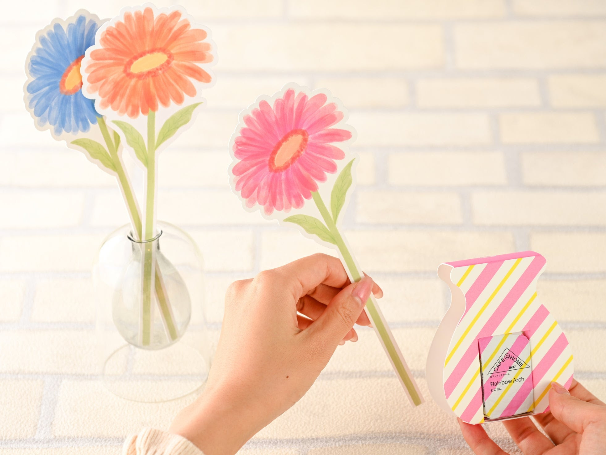 会場では、時間・天気・気分で選べるCAFE@HOME9種と、コンセプトに寄り添った花言葉を持つペーパーフラワー5種(各3色)を組み合わせた全135通りの限定商品を100円で販売。