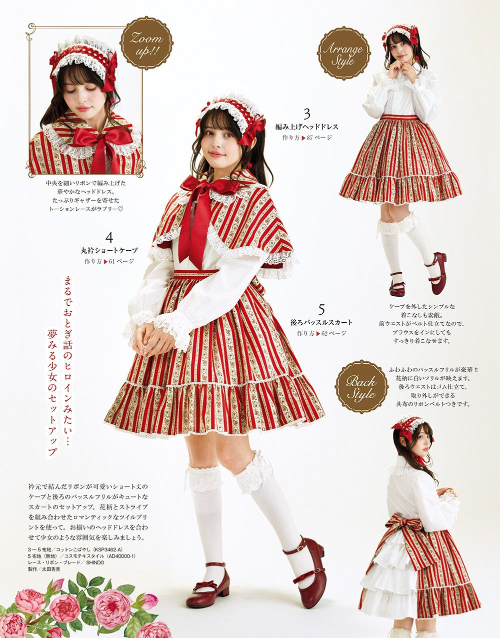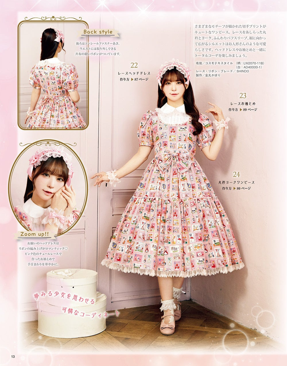 可愛らしい懐古ロリータから、気品あふれるゴシックエレガンス、素朴なカントリースタイル、そしてクラシカルなヒストリカルスタイルまで、幅広い世界観のお洋服を掲載。一部作品には実物大型紙が付属し、S/M/Lの3サイズ展開でお作りいただけます。
