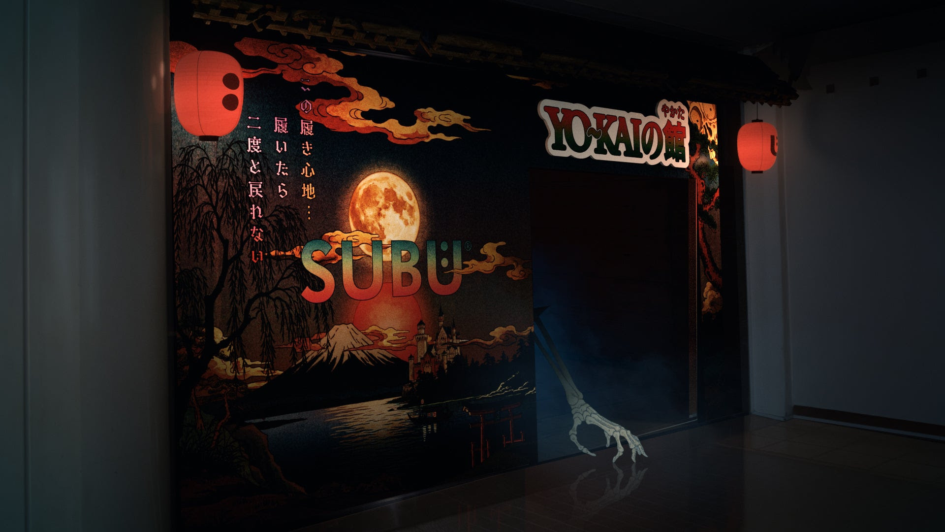 本POPUP STOREは「履いたら二度と戻れない…」をコンセプトに、“SUBU ×YO~KAI”の世界観をプロジェクションマッピング、映像やグラフィックなど多彩な表現で空間全体で来場者を異界へと誘うような没入体験型のイベントです。