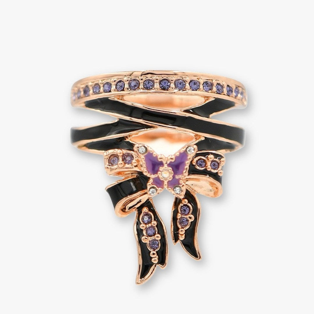 クラシカルな優美さとゴシックの神秘性が溶け合うリボンの中央には、ブランドの象徴である蝶を添えました。