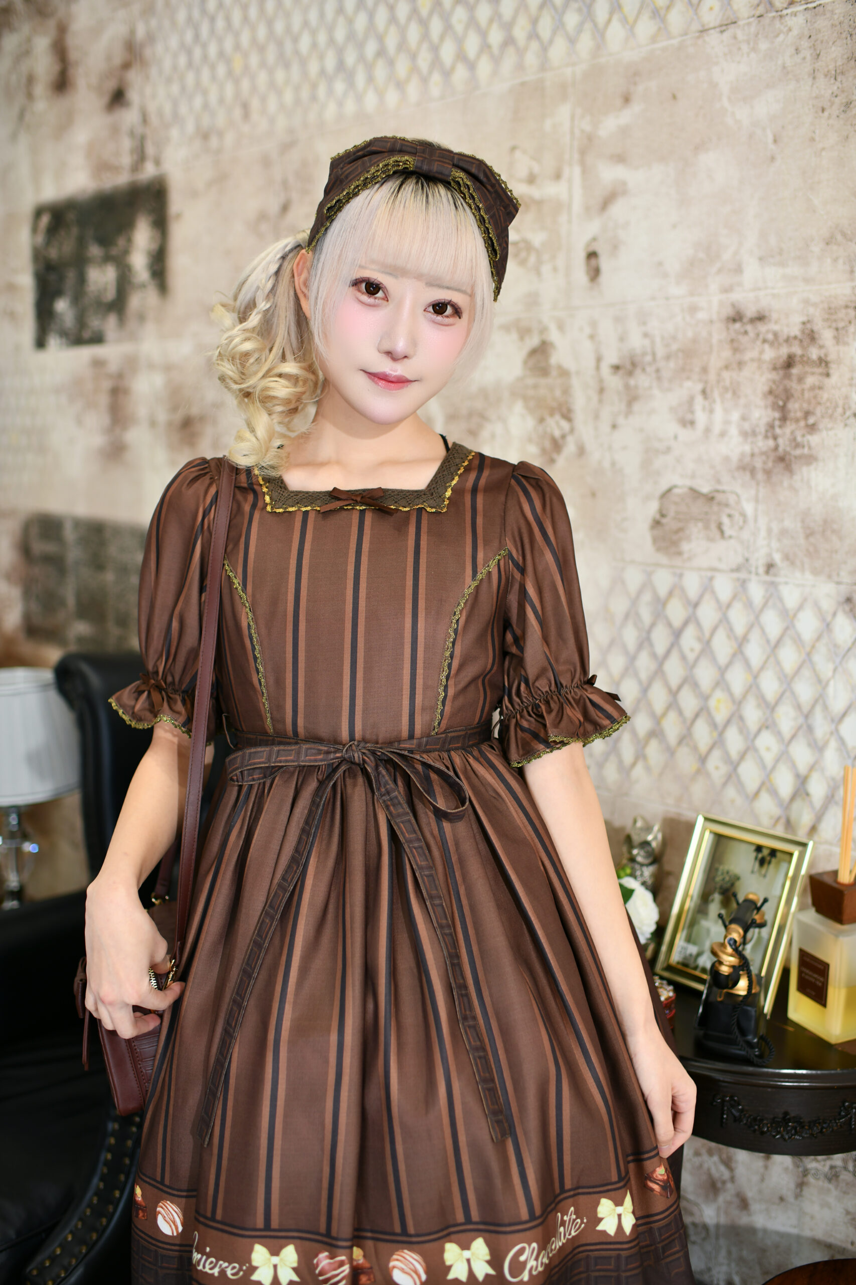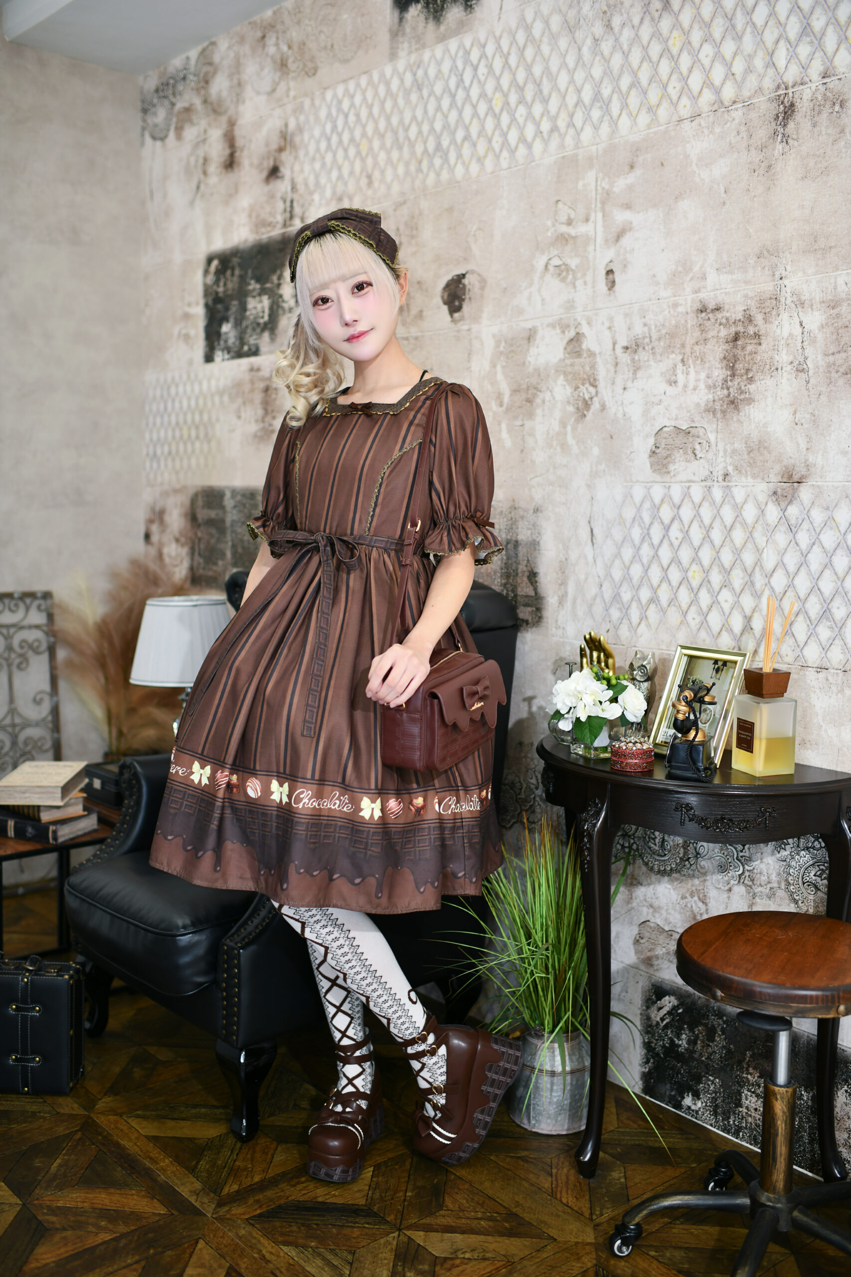 足元は、ソールまで板チョコ柄になった厚底シューズ。仕上げには、ワンピースと同布のビッグカチューシャをオン。