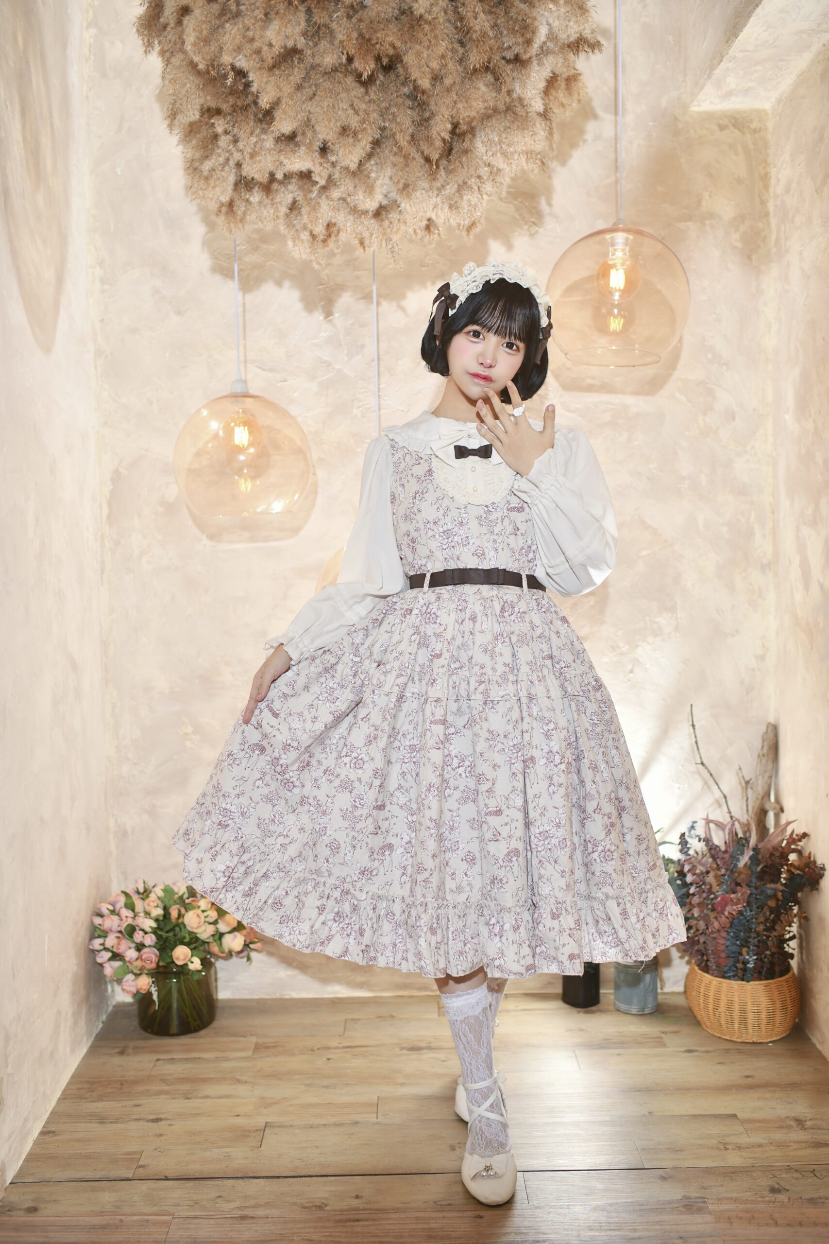 主役のジャンパースカートには、可憐に咲く花々とともに、森で暮らす小さな動物たちの姿が。