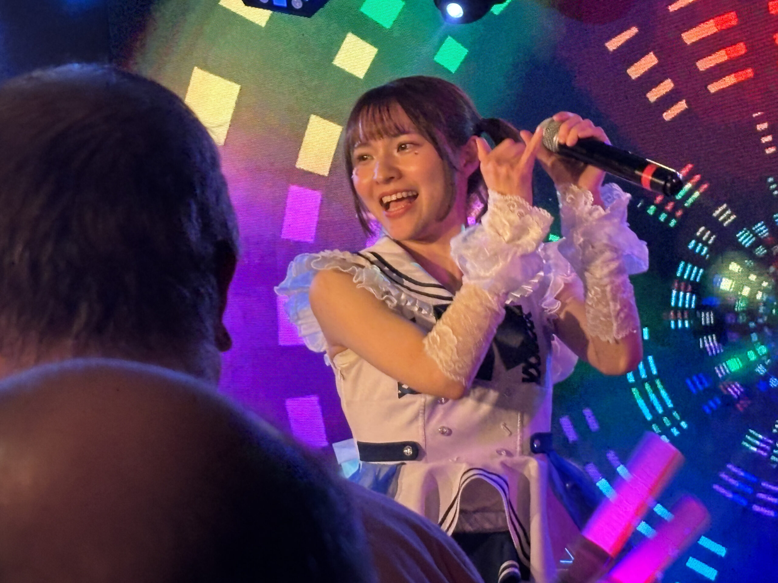 続く『シャカリキLOVE』では、愛らしい人形のような姿になって歌い躍るメンバーたちの姿が、とても眩しかった。中でも、生誕衣装を身につけた夢乃みゆの姿が、この曲ではひと際輝いて見えていた。antaresの楽曲は、胸の踊るBPMの速いポップなパーティーチューンが中心。すごいのが、1曲ごとにファンたちが異なるノリ方やコールを見せ、つかみを持ちながらも特色のある曲たちに、さらにノリで彩りを与えていること。観客たちのハートをドキッと騒がせるように歌いせまる夢乃みゆに向けて、フロア中から「かわいいかわいい超かわいい」と熱いコールが飛び交っていたのも印象的だった。