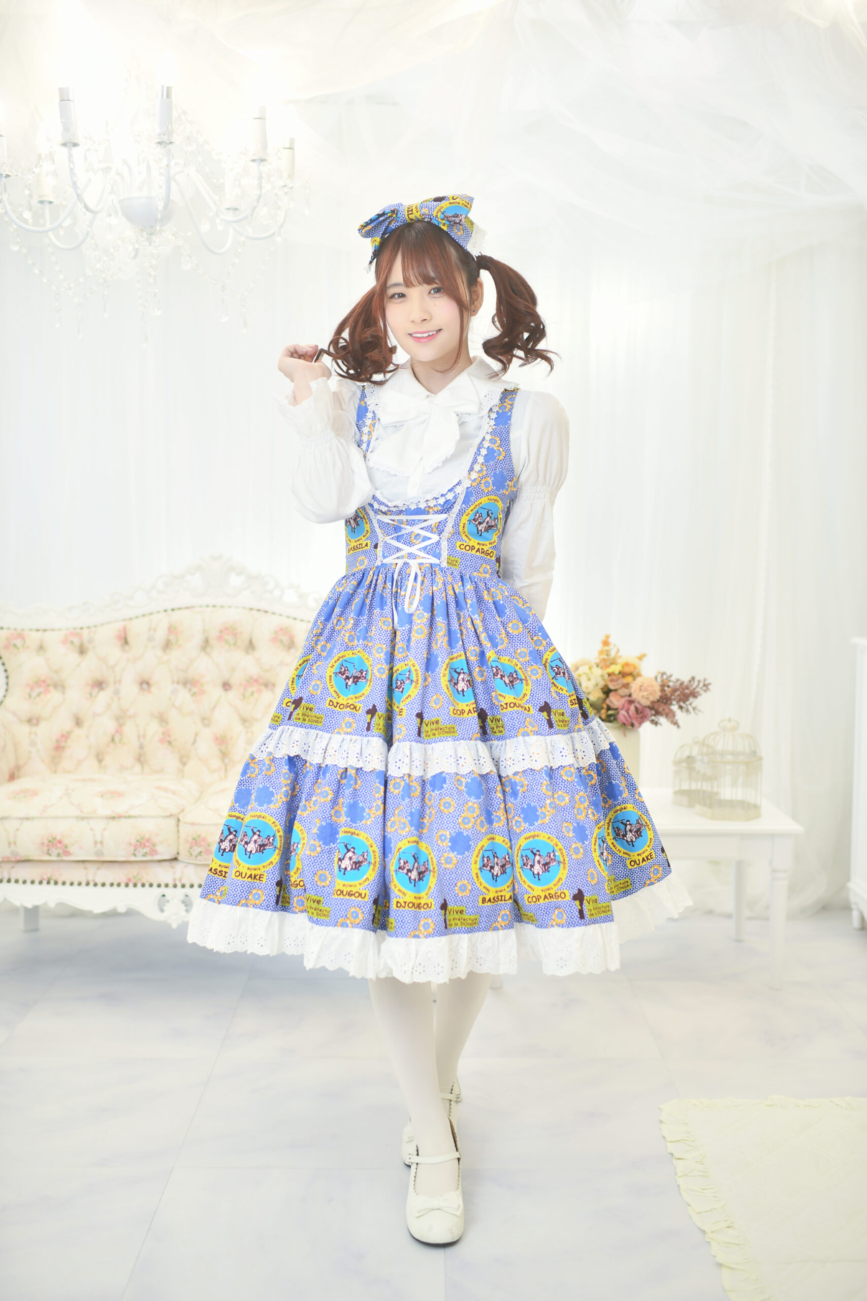 頭元を飾るのは、お洋服と同じテキスタイルを使用したリボンヘッドドレス。