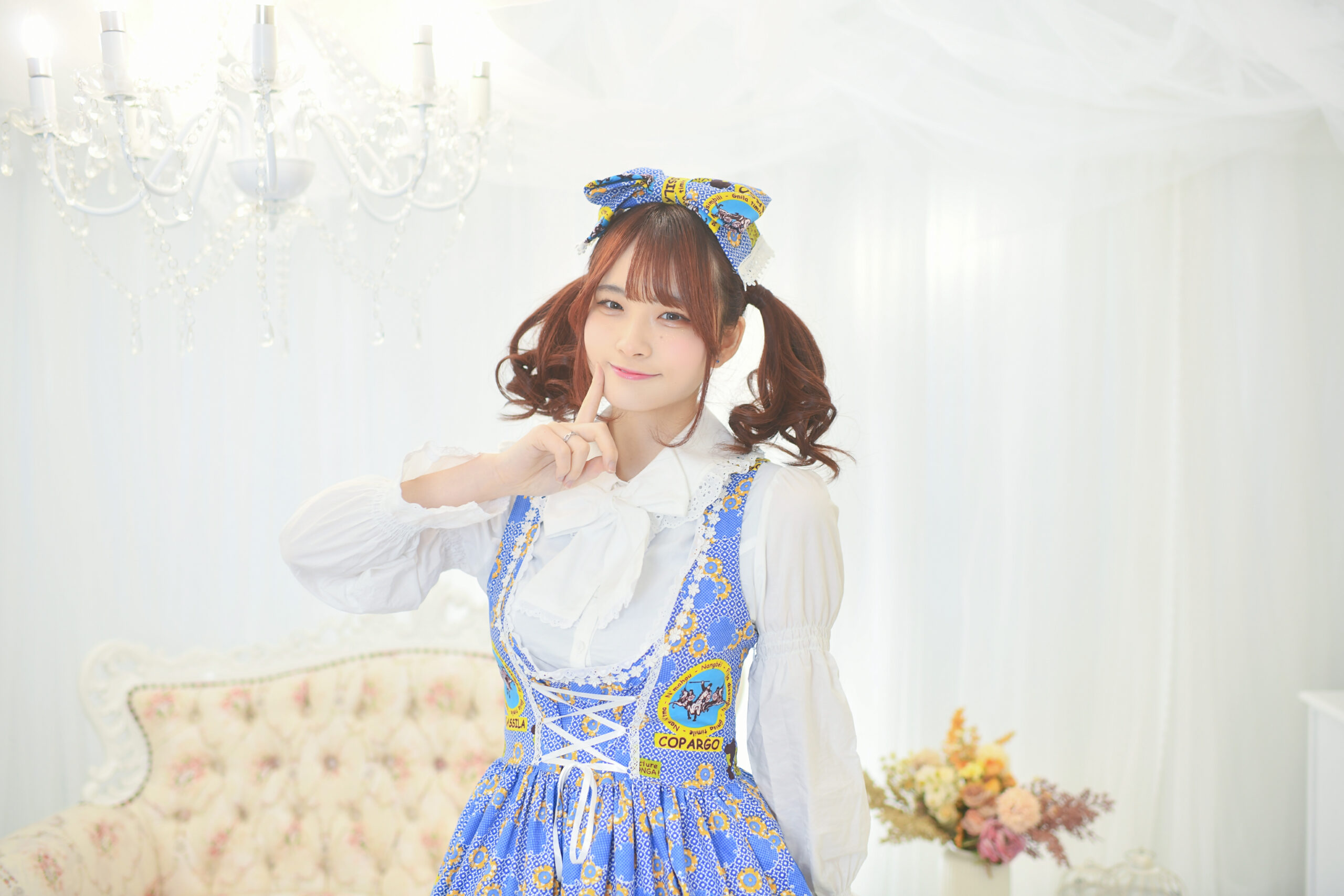 頭元を飾るのは、お洋服と同じテキスタイルを使用したリボンヘッドドレス。