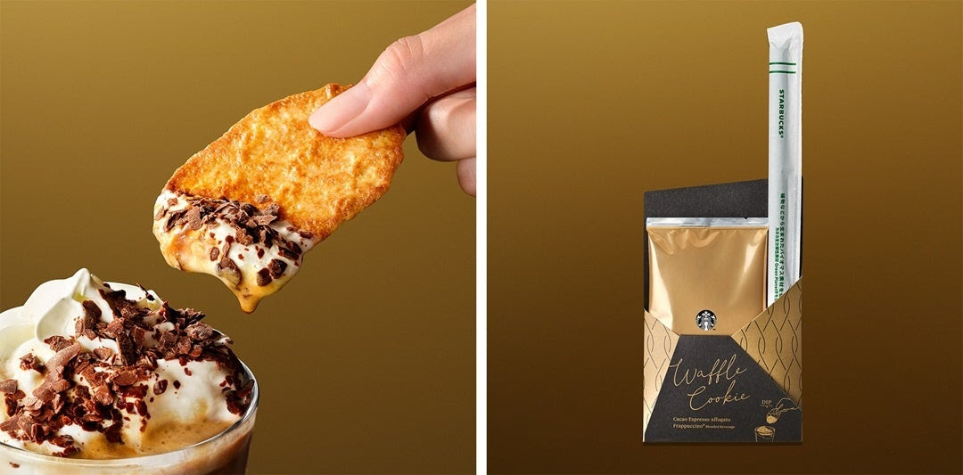 “極上のアフォガートフラペチーノ(R)体験”を完成させるのは、別添えのワッフルクッキーを“ディップして味わう”新しい体験。フラペチーノ(R)をすくい上げて口に運ぶたびに、香ばしいワッフルクッキーの食感が加わり、今年のバレンタインを忘れられない瞬間へ。スターバックスならではの“バレンタインを深く味わい、楽しむ体験”を大切な人と、また自分へのご褒美としても、何度もお楽しみください。
