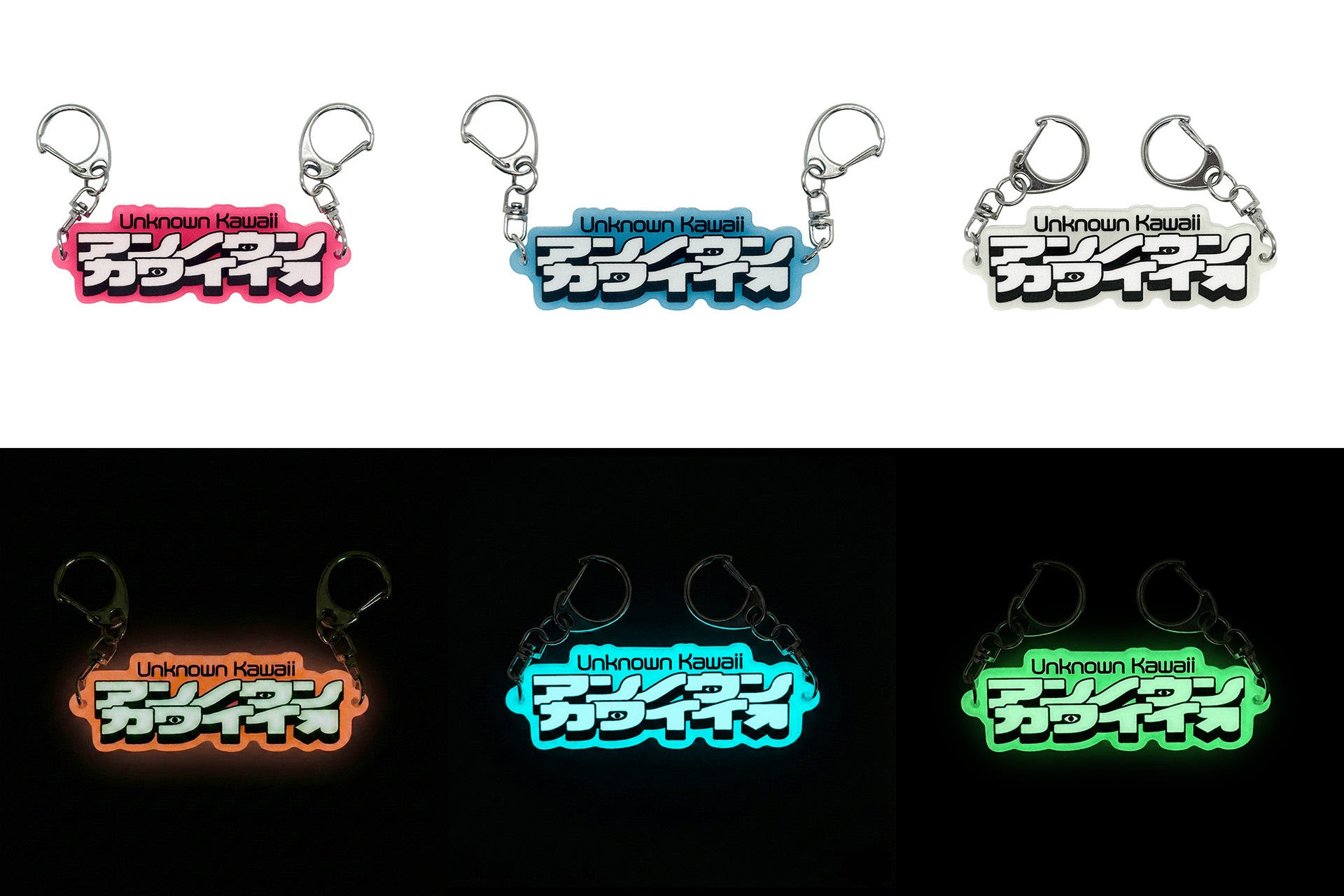 •アンノウン・カワイイ 蓄光キーホルダー(ピンク・ホワイト・ブルー3種) 各1,980円