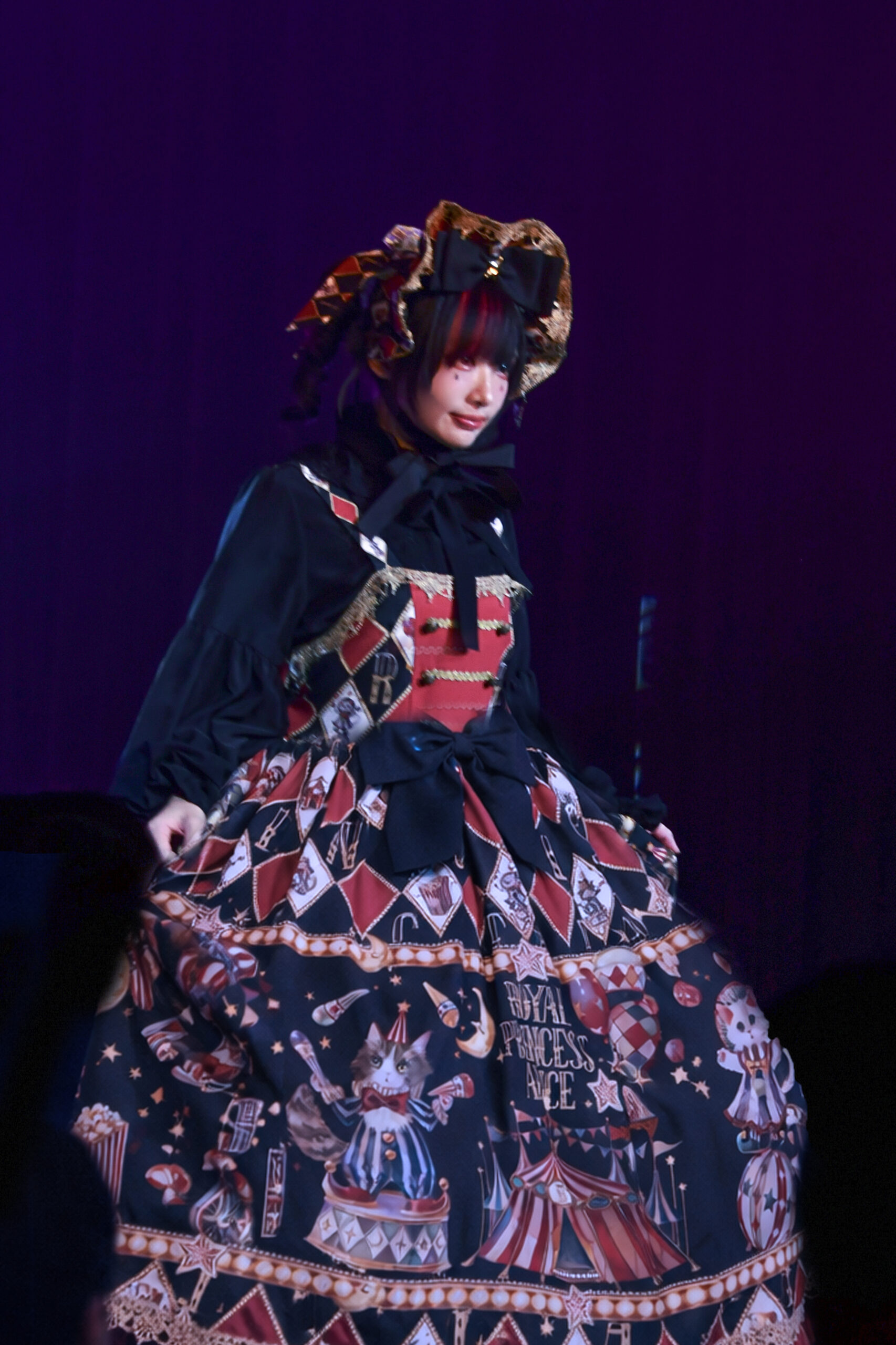漆黒の闇にゴールドやボルドーが映えるジャンパースカートには、サーカスの動物たちが緻密なタッチで描かれ、パニエで贅沢に広げられたスカートの中で、奇妙で美しい物語が今にも動き出しそう。胸元を飾る大きなリボンはアイコニックなアクセントとなり、ゴシックなインパクトをより一層強めています。