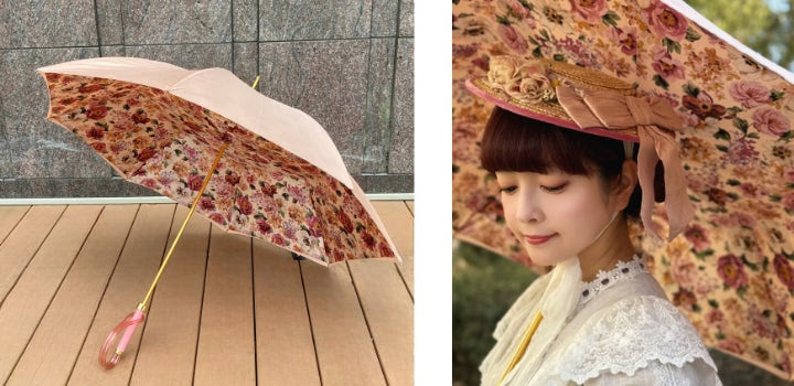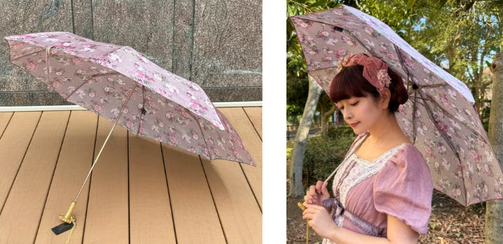 ピンクのトーンにこだわった愛らしいブーケのデザイン、宝箱から取り出したような折りたたみ傘に仕上げました。