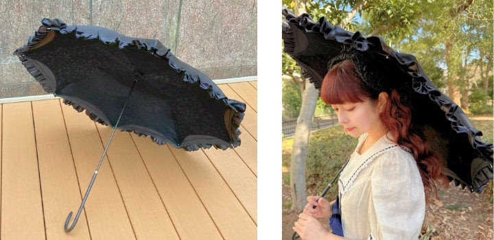 外側には存在感のあるクラシカルなフリル、内側にイタリアンレースを丁寧に縫い合わせた特別なパラソル。