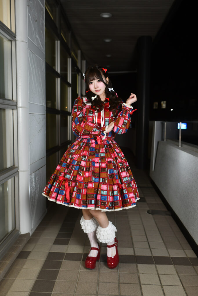 みぽたぽたちゃんが着こなすのは、赤のタータンチェックにチョコレートのようなフリルが映える「ミスショコラーヌジャンパースカート」。