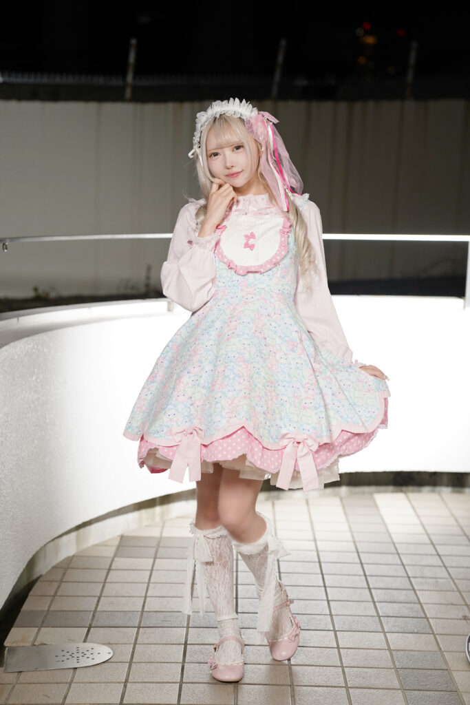 白空こあいちゃんは、淡いパステルピンクとブルーが溶け合う「クマさんは永遠の友達ジャンパースカート」で、幻想的な世界観を表現。